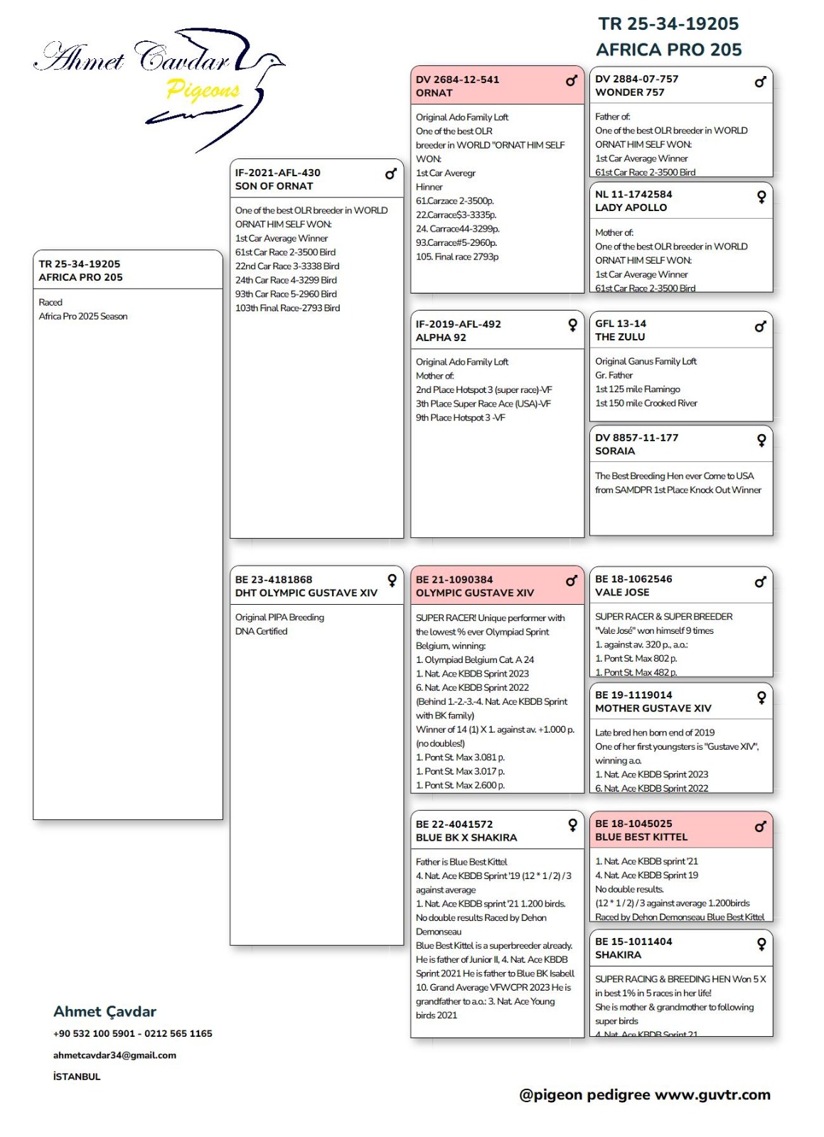 LOT 98 AFRIKAPRO AUCTION 1 – Ahmet Çavdar-TR-24-34-19205 -SIRE:IF-2021-AFL-430 SON OF ORNAT.One of the best OLR breeder in WORLD ORNAT HIM SELF WON: 1st Car Average Winner. 61st Car Race 2-3500 Bird. 22nd Car Race 3-3338 Bird.———–DAM:BE 23-4181868 DHT OLYMPIC GUSTAVE XIV.Original PIPA Breeding DNA Certified. SIRE IS SUPER RACER! Unique performer with the lowest % ever Olympiad Sprint Belgium, winning: 1. Olympiad Belgium Cat A 24 1. Nat. Ace KBDB Sprint 2023 6. Nat. Ace KBDB Sprint 2022 (Behind 1-2.-3.-4. Nat Ace KBDB Sprint with BK family) Winner of 14 (1) X 1. against av. +1.000 p..SEE PEDIGREE!!!
