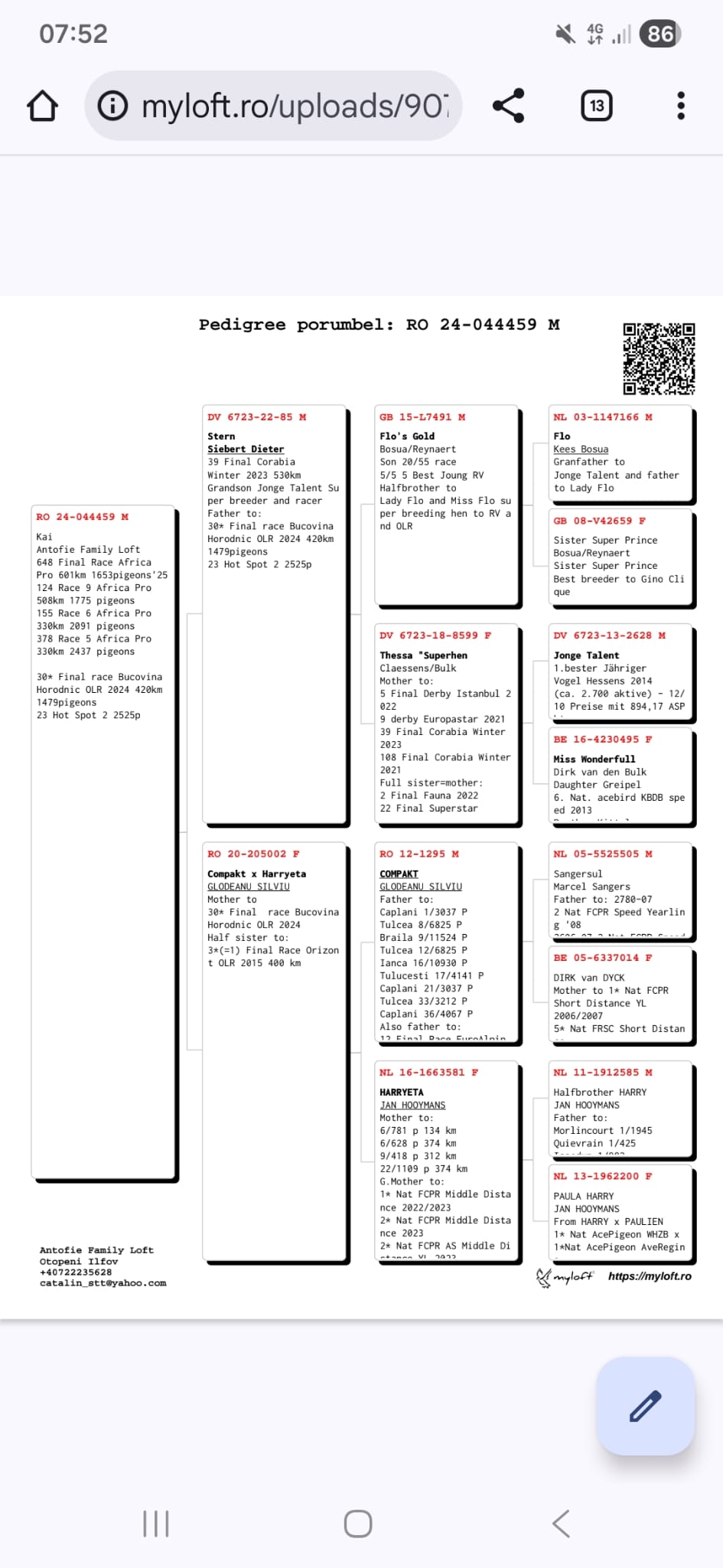 LOT 98 AFRIKAPRO AUCTION 3 – Berghe, Bartos-Antofie, Jurrisen/Palomablue-RO-24-0044459 -SIRE:DV 6723-22-85 M.Siebert Dieter 39 Final Corabia Winter 2023 530km Grandson Jonge Talent Su per breeder and racer Father to: 30 Final race Bucovina Horodnic OLR 2024 420km 1479pigeons 23 Hot Spot 2 2525p.————DAM:RO 20-205002 F.Compakt x Harryeta GLODEANU SILVIU Mother to 30 Final race Bucovina. Horodnic OLR 2024 Half sister to: 3*(1) Final Race Orizon t OLR 2015 400 km.SEE PEDIGREE!!!