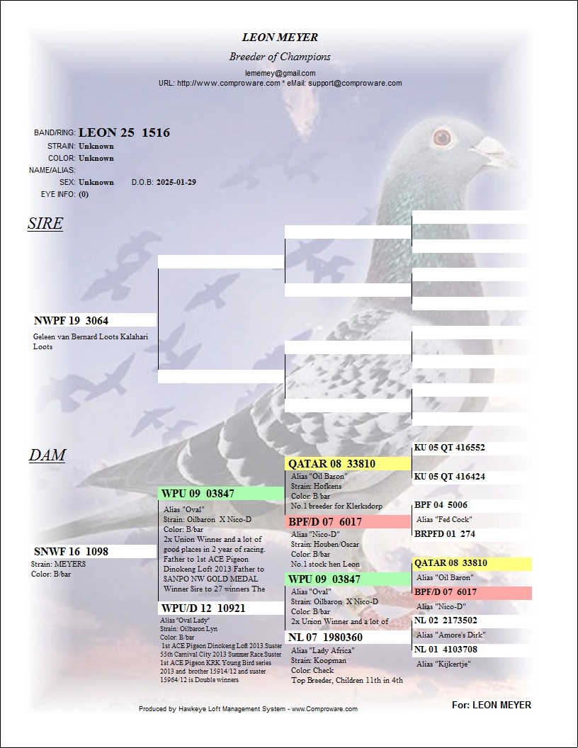 LOT 36 MARLBANK OLR – FEATHER LOFT-ZA-24-NDK-1074 -SIRE:1767 WRRPA 15 ZA.Alias “Sven” St rain: Van Loon Cross Color: Blue Bar 1st Union Verkeerdevlei Open 2018 2nd Union Smithfield YB 2017 6th Union Verkeerdevlei Open 2016 Father of 3 t ime winner. (3966 – 16).———-DAM:41 NDKO 21 ZA.St rain: De Klak Janssen Color: Blue Bar 22nd Best Bird Sprint WRRPA 2021 9th Best Bird Sprint NDK 2021 2022: 31st Best Bird NDK Club Combine co-winner Colesberg: 2023: 1ste Beste duif in die klub 2023. 18th Best open bird WRRPA 2023. 14th Best open bird GWC 2023.SEE PEDIGREE!!!