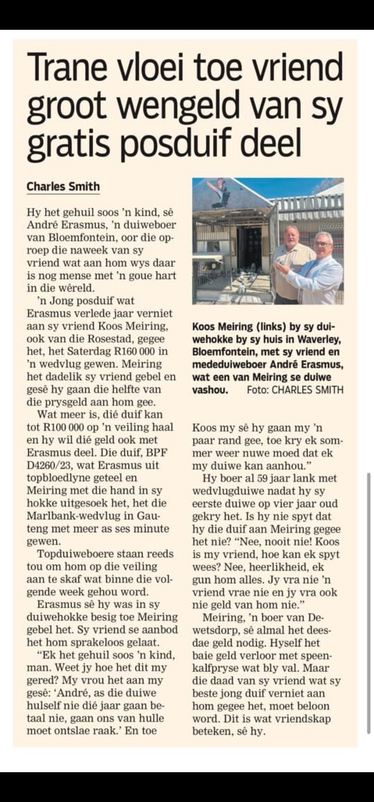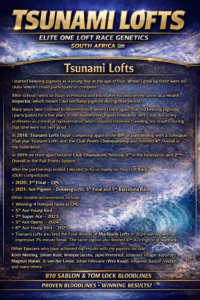 .LOT 1 ANDRE ERASMUS “TSUNAMI LOFTS” – 0239 ZA 16 NOVPF ———A powerhouse Tom Lock bred cock, carrying some of the most dominant and proven South African breeding lines. “Mank Cock” has already proven his value in the breeding loft, credited with breeding at least 10 winners, including a One Loft Race Marlbank Final winner in 2024 with a break of 7.5 minutes, an exceptional performance that highlights the strength of this family. His strike rate is reported to be at least 80%, making him a highly reliable breeder that is still fertile and producing quality youngsters in 2025 and 2026.——-SIRE: 18448 ZA GPU 13 – “RED HEART 48” A powerfully bred Tom Lock cock carrying some of the most proven South African winning bloodlines. “Red Heart 48” is bred from the Golden Breeder line, a dynasty responsible for multiple SANPO medal winners and elite performers. His sire 11719 ZA THU 07 – “Golden Breeder” is a legendary breeder credited with 4× SANPO Gold Medals, making him one of the most influential producers in the Tom Lock lofts. The line traces further to “Juan 2” (6368 THU 05) and “Hermien” (18450 SA THU 04), reinforcing a foundation of consistent performance and proven genetics. 0239 NEW On the dam side of “Red Heart 48” we find 15749 ZA THU 09 – SANPO Gold Medal Winner, descending from the legendary 19150 THU 02 – “R80 000 Super Cock”, a double winner and sire to 21 winners, widely recognised as one of the cornerstone breeders of the Tom Lock strain.————–AM: 7162 OERF ZA 11 – “ROSE” “Rose” represents the famous Mortimer / Super Pair Hawk Hen bloodline, one of the most consistent breeding families in South African pigeon sport. She is a daughter of 19150 THU 02 – “R80 000 Super Cock”, the legendary Tom Lock breeder whose descendants have produced numerous winners and top positions nationwide. 0239 NEW The maternal side carries elite breeding power through 2039 SA 01 – “R25 000 Cock”, a son of Mortimer Cock, and the famous 4869 THU 99 – “Super Pair Hawk Hen”, known for producing a long list of winners and top racers.SEE PEDIGREE!!!!