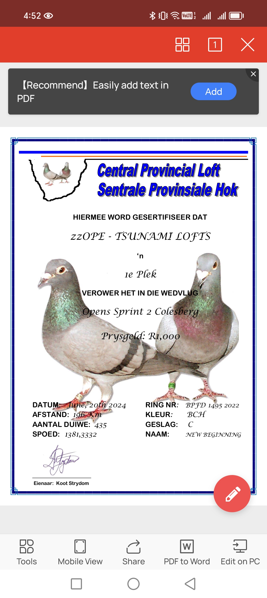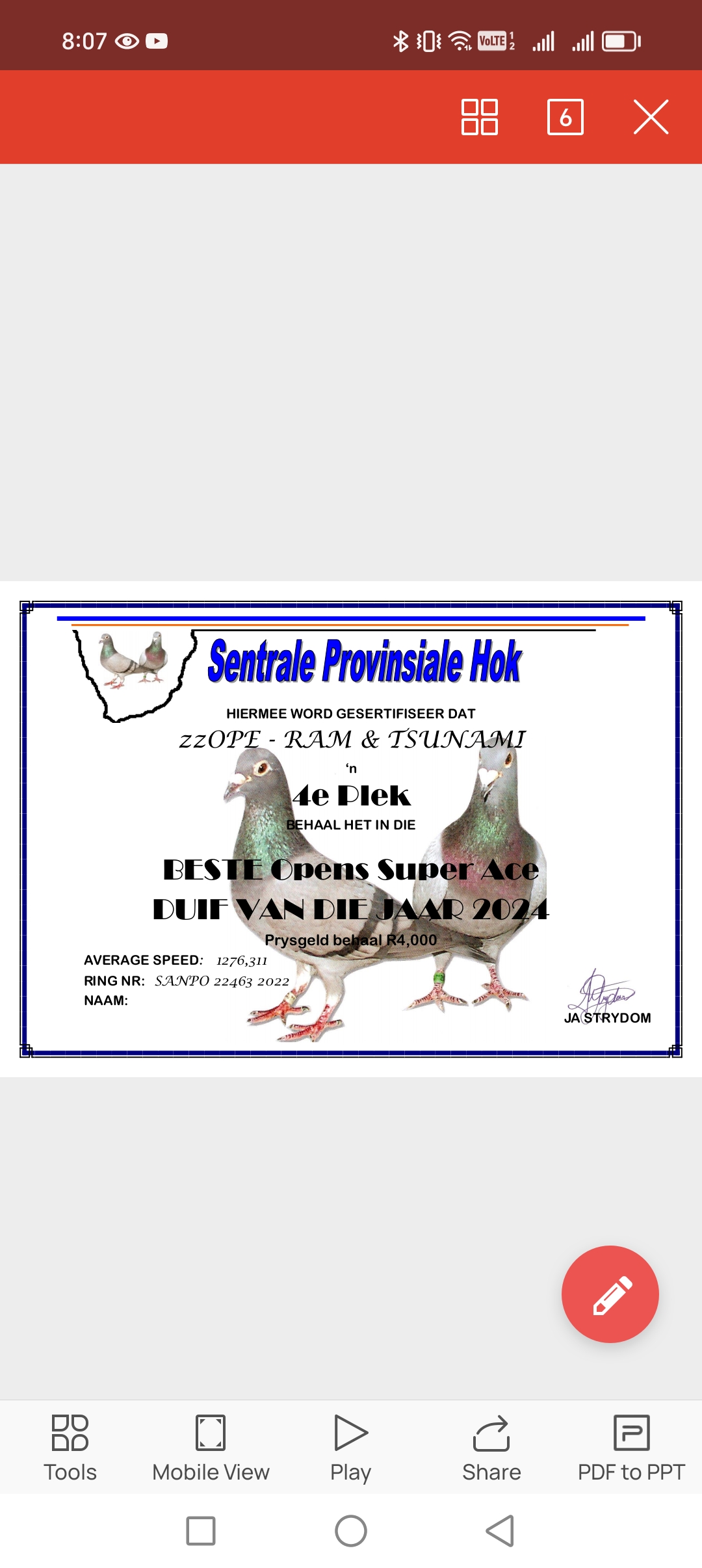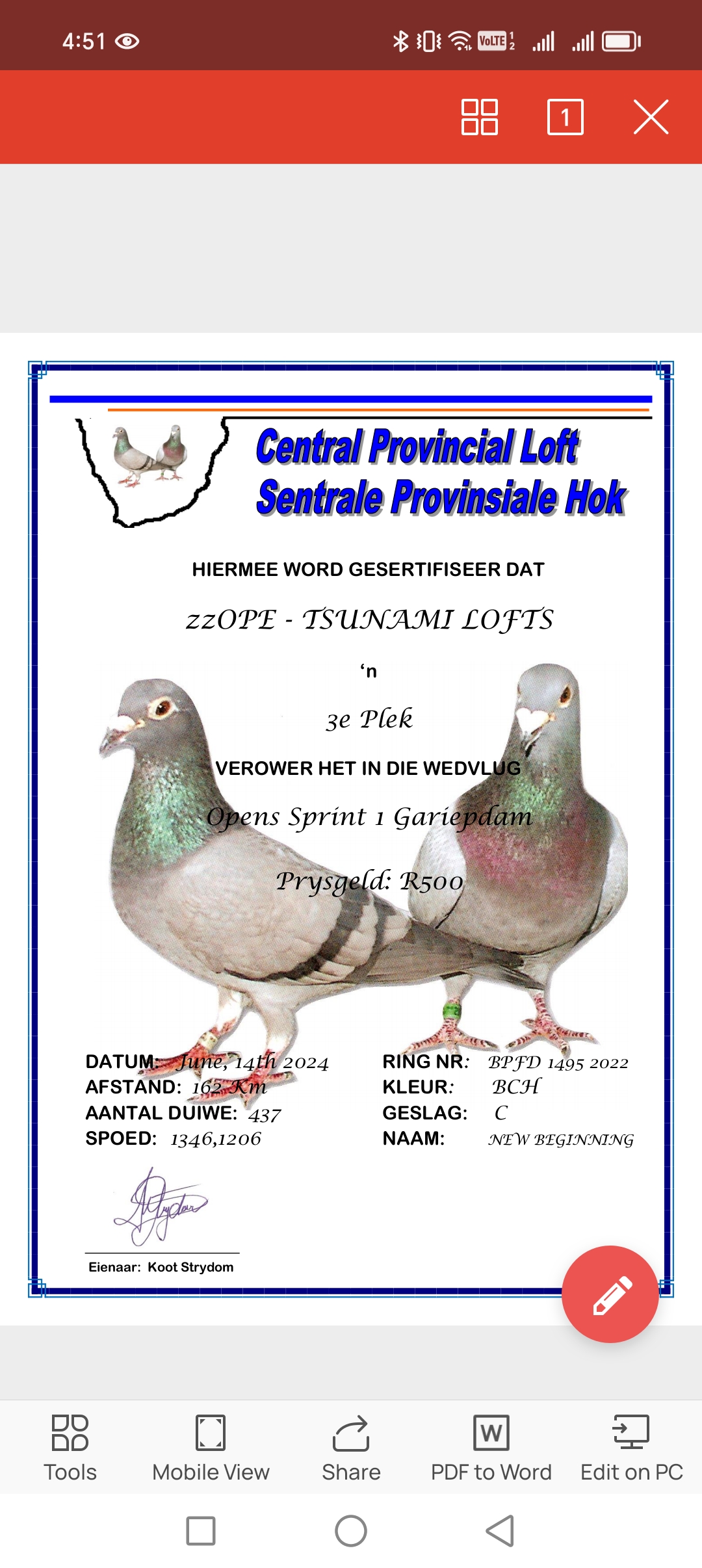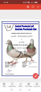 .LOT 3 ANDRE ERASMUS “TSUNAMI LOFTS” – 84244 ZA 18 -SIRE:ZA 15 03989 “OOM KOOS 1”. GIFT FROM HENDRIK HUYSER BROTHER TO BEST BIRD PTA COMBINE.———-DAM:ZA 11 06411. LOU WOUTERS / JANSEN.SEE PEDIGREE!!!