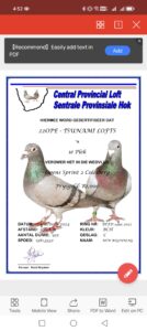 LOT 14 ANDRE ERASMUS “TSUNAMI LOFTS” – 22455 SANPO 22 -FIRST BABY BRED OUT OF THIS COCK WITH “PELLO” MY DINOKENG ACE HEN 7TH FED MONEY RINGS BPFW 2025 WINNING R14 000 2025—————SIRE: 6173 NKHPT 21 – “HOPETOWN COCK” A powerful Sablon-bred cock loaded with proven 810 Sablon Superbreeder blood, one of the most dominant long-distance and One Loft Race breeding lines in South Africa. He is already proving himself in the breeding loft as grandsire to four Ace Birds at CPL OLR over the last three years, showing his ability to pass on class, durability and race intelligence. 22479 His pedigree combines the best of the Jimmys Boy × Pippa Sablon cross: Jimmys Boy (2004 CYRILS 16) – immediate success at stock, breeding top One Loft performers including 2nd Hotspot winner CPL and 6th Final Klapmuts OLR performers. Pippa (2656 SVPV 17) – heavily inbred to the legendary 810 Sablon, from a family responsible for numerous winners. She is full sister to Rocky, Fine Design and Rough Design, all outstanding breeders of winners.———–DAM: 2682 SVPV 17 – “ROUGH DESIGN” “ROUGH DESIGN” is one of the cornerstone hens of the Tsunami Lofts Sablon family and is widely regarded as one of the best breeding hens ever owned in the loft. Together with her sister Fine Design, she achieved an exceptional breeding strike rate of around 90%, producing winners and top performers in both Federation racing and One Loft Racing. She is a direct daughter of the famous 810 Sablon breeding dynasty, descending from the Bak 17 Superbreeder line, one of the most influential breeding families in modern pigeon sport. This line has produced numerous club winners, combine winners and OLR champions across the world. 2543 The descendants of “ROUGH DESIGN” continue to perform at the highest level, with multiple generations already proving their class in major competitions.SEE PEDIGREE!!!!