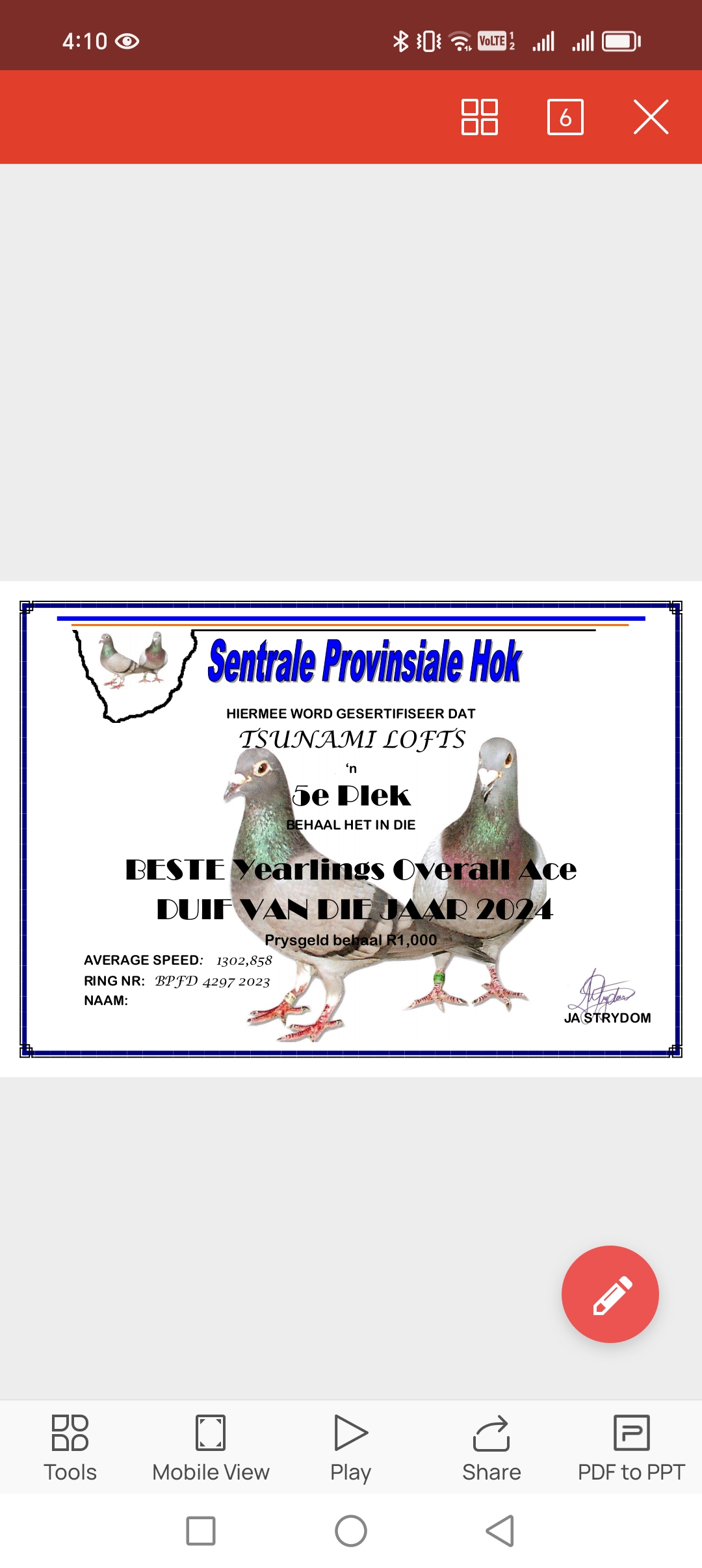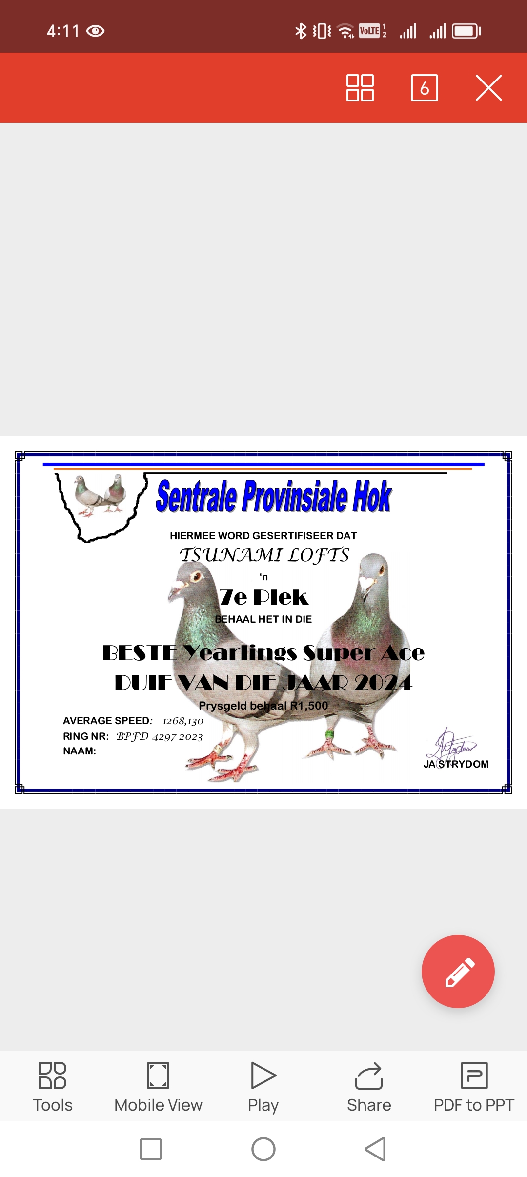 LOT 20 ANDRE ERASMUS “TSUNAMI LOFTS” – 4297 ZA BPF 23 -2024 5th Yearling Overall Ace Pigeon R1,000; 7th Yearling Super Ace Pigeon R1,500————-SIRE: ZA 22 VPU 8653. SUPER INBRED TOM LOCK. BRED BY OUT OF AFRICA LOFTS.———-DAM: ZA 22 SANPO 22469 . SIRE IS BRED OUT OF JIMMY’S BOY AND PIPPA. DAM IS BRED OUT OF BOYTJIE AND JBM’S GIRL.SEE PEDIGREE!!