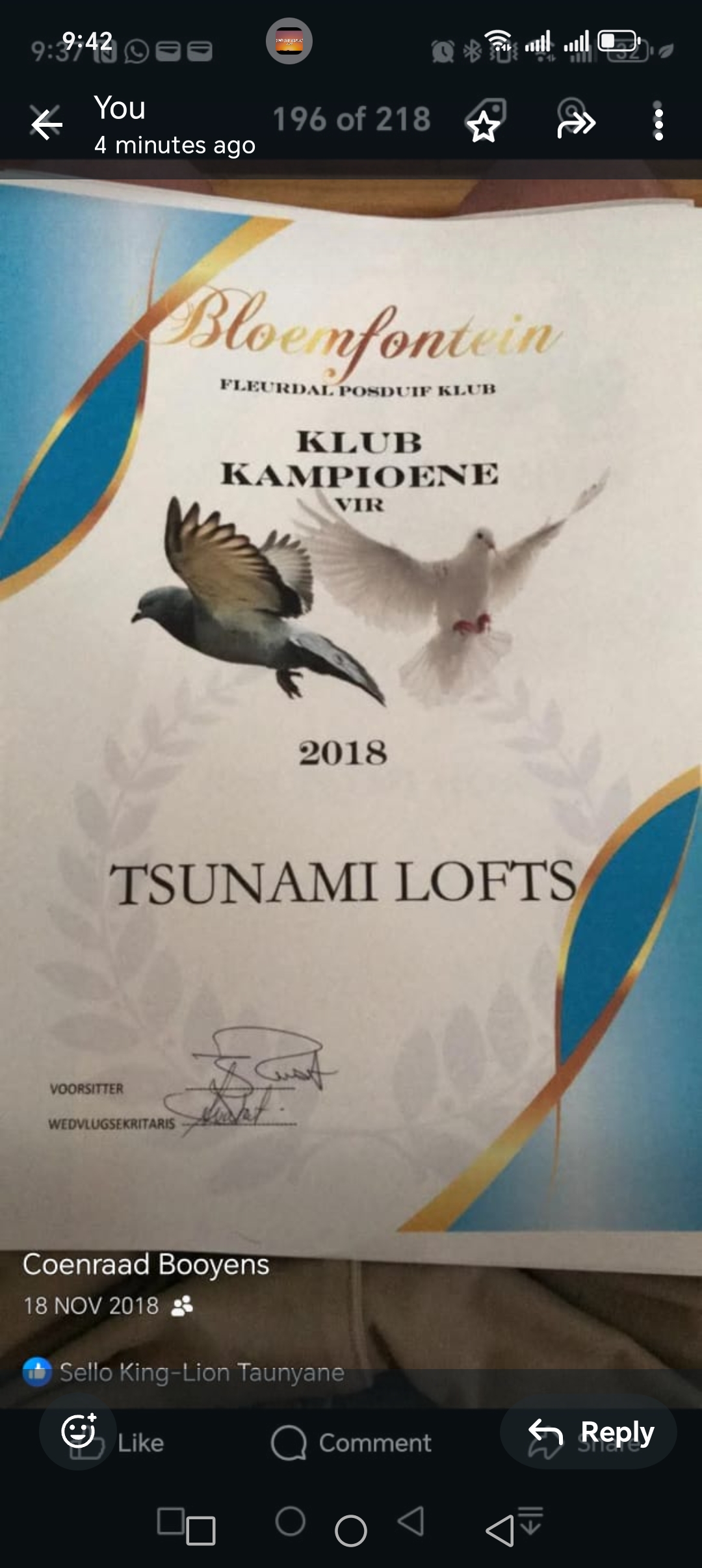 LOT 33 ANDRE ERASMUS “TSUNAMI LOFTS” – D4264 ZA BPF 23 -THIS IS THE ONLY AND LAST SON TO BE BRED OUT OF THIS SUPER PAIR. IRREPLACEBLE!!!! HURT HIS WING IN BREEDING LOFT————-Sire: 1509 ZAKPF 20 The sire of 4264 is a super inbred cock to the legendary Braveheart × Zena pairing, one of the most influential Tom Lock combinations in South African pigeon racing. This mating concentrates some of the strongest proven genes in the Tom Lock dynasty. In the background we find “Tyson” (2656 ZASVPV 16) and “Miss Zena” (1468 ZABPF 19), both directly tied to the famous Braveheart (43359 ZA 11) and Zena (15087 ZA GPU 11) bloodlines. Braveheart proved himself in the stock loft for JBM Hertzog and produced top performers including Allflight Final and Dinokeng OLR achievers, while Zena comes from elite SANPO medal-winning lines. This sire line is heavily linebred to reinforce proven racing ability, durability and class.————-Dam: 12489 OP 12 The dam is a direct daughter of the famous “Super Breeder” (23597 ZA THU 05) paired to the R80K Daughter (55346 ZA OP 06). The Super Breeder is a champion-producing cock bred from the legendary R80 000 Super Cock (19150 THU 02) and Double Winner (1648 SA THU 03) – a pairing responsible for numerous winners and outstanding racers. The R80K Daughter represents the very best of the Tom Lock family and traces back to elite producers including the R100 000 Egg Cock, Super Pair Hawk Hen, and other top-class foundation breeders. Notably, this hen is also a full sister to “Oogappel” and other famous performers, making her a genetically powerful breeding hen from one of the most successful families in the loft.SEE PEDIGREE!!!