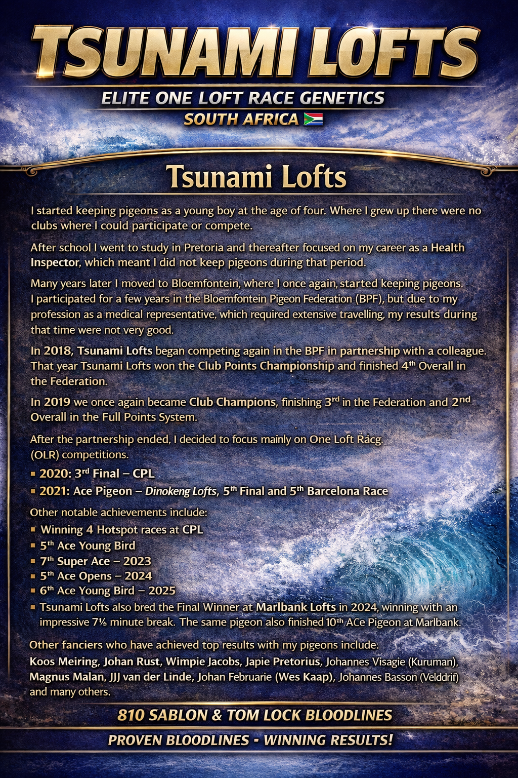 .LOT 9 ANDRE ERASMUS “TSUNAMI LOFTS” – 2543 ZA BPF 24 -SIRE: 14999 ZA SVPV 15 – “HOTSHOT” A direct son of the legendary 810 Sablon breeding line, “HOTSHOT” represents one of the most powerful breeding families ever imported into South Africa. He is a full brother to famous Sablon legends such as Fine Design, Rough Design, Pippa and Rocky, pigeons that have produced champions across multiple One Loft Races. “HOTSHOT” is bred from the famous BOYTJIE (4615 CYRILS 14) and JBM’S GIRL (4864 CYRILS 14) pairing.————–DAM: 2682 SVPV 17 – “ROUGH DESIGN” “ROUGH DESIGN” is one of the cornerstone hens of the Tsunami Lofts Sablon family and is widely regarded as one of the best breeding hens ever owned in the loft. Together with her sister Fine Design, she achieved an exceptional breeding strike rate of around 90%, producing winners and top performers in both Federation racing and One Loft Racing. She is a direct daughter of the famous 810 Sablon breeding dynasty, descending from the Bak 17 Superbreeder line, one of the most influential breeding families in modern pigeon sport. This line has produced numerous club winners, combine winners and OLR champions across the world. 2543 The descendants of “ROUGH DESIGN” continue to perform at the highest level, with multiple generations already proving their class in major competitions.SEE PEDIGREE!!!!