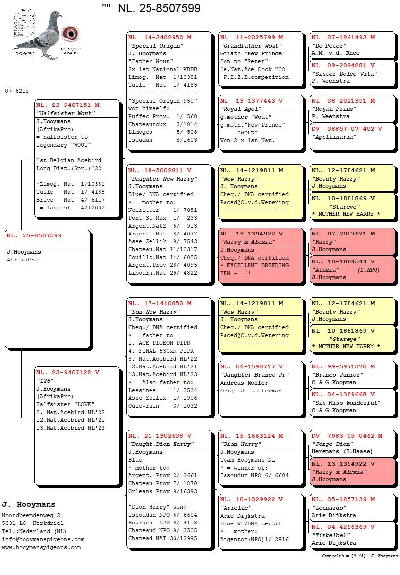 LOT 65 AFRIKAPRO AUCTION 2 -Jan Hooymans I-NL-24-8507581 – SIRE:NL. 23-9407121 M “Daughter Knockout” J.Hooymans.DAM IS Daughter Harry Jr. J.Hooymans Blue wf DNA.———–DAM:L. 23-9407220 V “220” J.Hooymans. GRAND DAUGHTER TO WORLD FAMOUS “BIRDY”.SEE PEDIGREE!!!