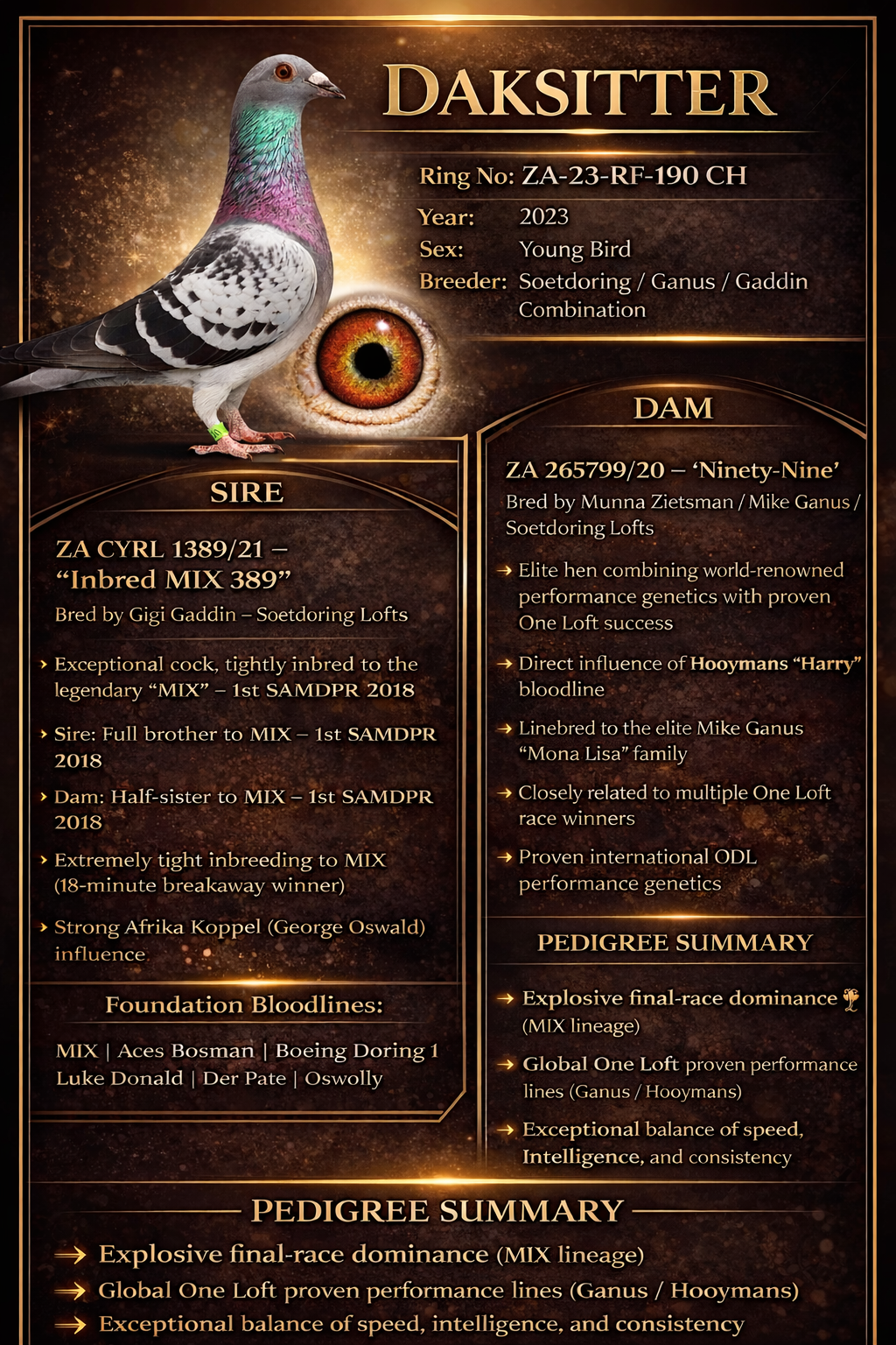 .LOT 6 EASTER AUCTION – ZA 23 RF 190 HEN-SIRE:ZA CYRL 1389/21 – “Inbred MIX 389” Bred by Gigi Gaddin – Soetdoring Lofts An exceptional cock, intensely inbred to the legendary “MIX” – 1st SAMDPR 2018, one of the most dominant One Loft performers of modern times. This cock represents a concentrated genetic powerhouse, designed to reproduce elite racing ability. Directly stacked with performance genes: Sire: Full brother to MIX – 1st SAMDPR 2018 Dam: Half-sister to MIX – 1st SAMDPR 2018 Extremely tight inbreeding to MIX, the famous 18-minute breakaway winner Strong influence from Afrika Koppel (George Oswald) bloodlines Carries elite foundation genetics including MIX, Aces Bosman, Boeing Doring 1, Luke Donald, Der Pate, and Oswolly————-DAM:ZA 265799/20 – “Ninety-Nine” Bred by Munna Zietsman / Mike Ganus / Soetdoring Lofts A top-class hen combining some of the most proven international One Loft race bloodlines, carefully blended for performance, intelligence, and reliability. Direct influence of Hooymans “Harry”, one of the most successful global breeding lines Linebred to the elite Mike Ganus “Mona Lisa” family, known for consistent winners Closely related to multiple One Loft race winners Proven international OLR performance genetics throughout the pedigree Balanced genetic structure combining speed, endurance, and race intelligence 👉 A refined breeding hen, built on global champion lines with a proven record of producing top performers.SEE PEDIGREE!!!!