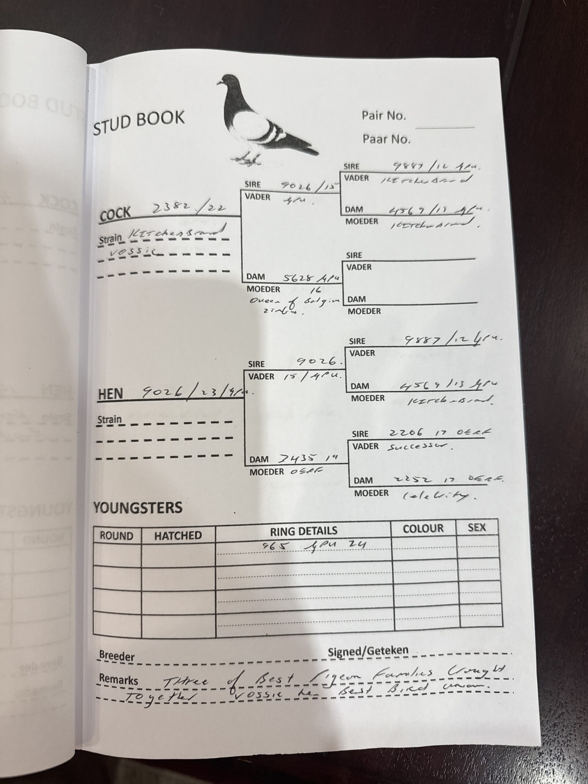 LOT 32 AFRIKAPRO AUCTION 2 -Pigeon Palace 1-ZA-24-JWDK-4120 -SIRE: BELG 20 6243189 “KATALIS NEW KIM”. KAASBOER. BROTHER X NIECE NEW KIM BOUGHT FROM PIPA. INBRED BROTHER AND NIECE TO 1ST NAT ACE BIRD “NEW KIM”. FATHER IS FULL BROTHER TO NEW KIM.———DAM:OERF-20-8163 H”GEMMA”. Super handler and silky soft feathers. Joseph’s mix purchases R132 000, father to 20th place winner at Afrika Pro 2024 final race and Anel on PIPA auction for R95 000. Anel is grandmother to Race 6 and Race 7 13th place winner at Afrika Pro 2024. Anel is grand mother to 2nd Ace.SEE PEDIGREE!!!