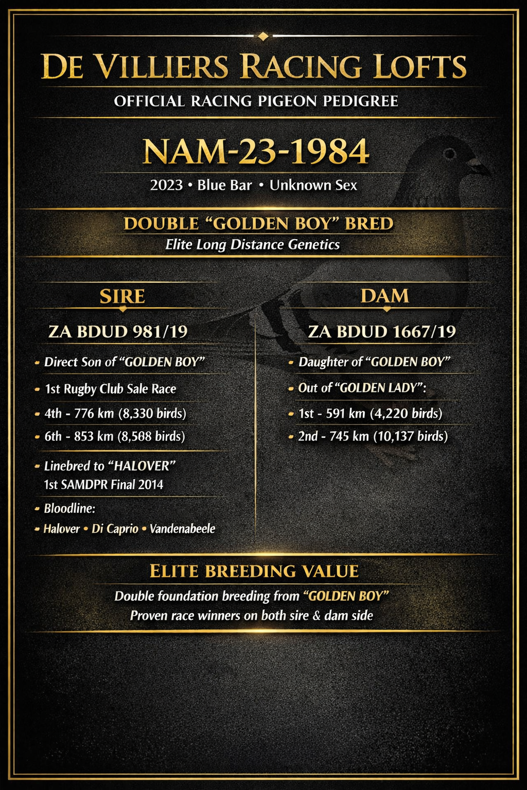 .LOT 6 EARLY APRIL – NAM 23 1984 HEN -SIRE:ZA BDUD 981/19, is a direct son of “Golden Boy”, already proving his class with top performances including 1st Rugby Club Sale Race, along with excellent positions at 776 km (4th vs 8,330 birds) and 853 km (6th vs 8,568 birds). He is further strengthened by being linebred to “Halover” (1st SAMDPR Final 2014), combining elite endurance with consistency. His bloodline carries the strength of Halover, Di Caprio, and Vandenabeele, making him a top-class breeding cock.———–DAM:ZA BDUD 1667/19, is a daughter of “Golden Boy” and out of the outstanding “Golden Lady”, bringing together elite performance on both sides. She has proven herself in tough competition with 1st place at 591 km (4,220 birds) and 2nd at 745 km (10,137 birds) — clear evidence of her class, durability, and racing intelligence.SEE PEDIGREE!!!!