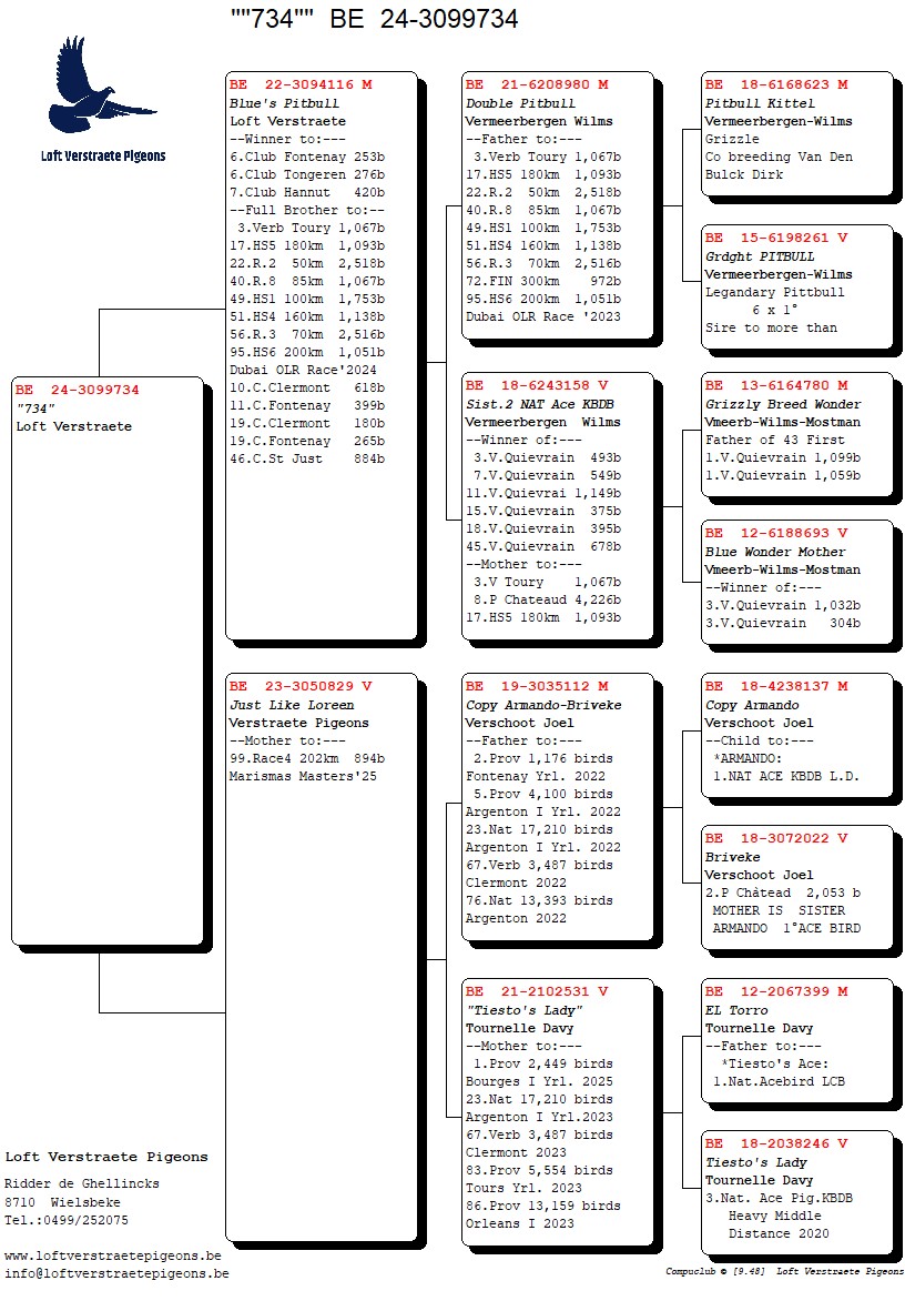 Z..LOT 106 AFRIKAPRO AUCTION 2 -Loft Verstraete – Brantegem 2-BE-24-3099734 -SIRE:22-3094116 M Blue’s Pitbull Loft Verstraete –Winner to:— 6.Club Fontenay 253b, 6.Club Tongeren 276b, 7.Club Hannut 420b, –Full Brother to:– 3. Verb Toury 1,067b, 17.HS5 180km 1,093b, 22.R.2 50km 2,518b, 40.R.8 85km 1,067b————–DAM:BE 23-3050829 V.”Just Like Loreen”.VERSTRAETE.BRED FROM Copy Armando-Briveke Verschoot Joel.SEE PEDIGREE!!!
