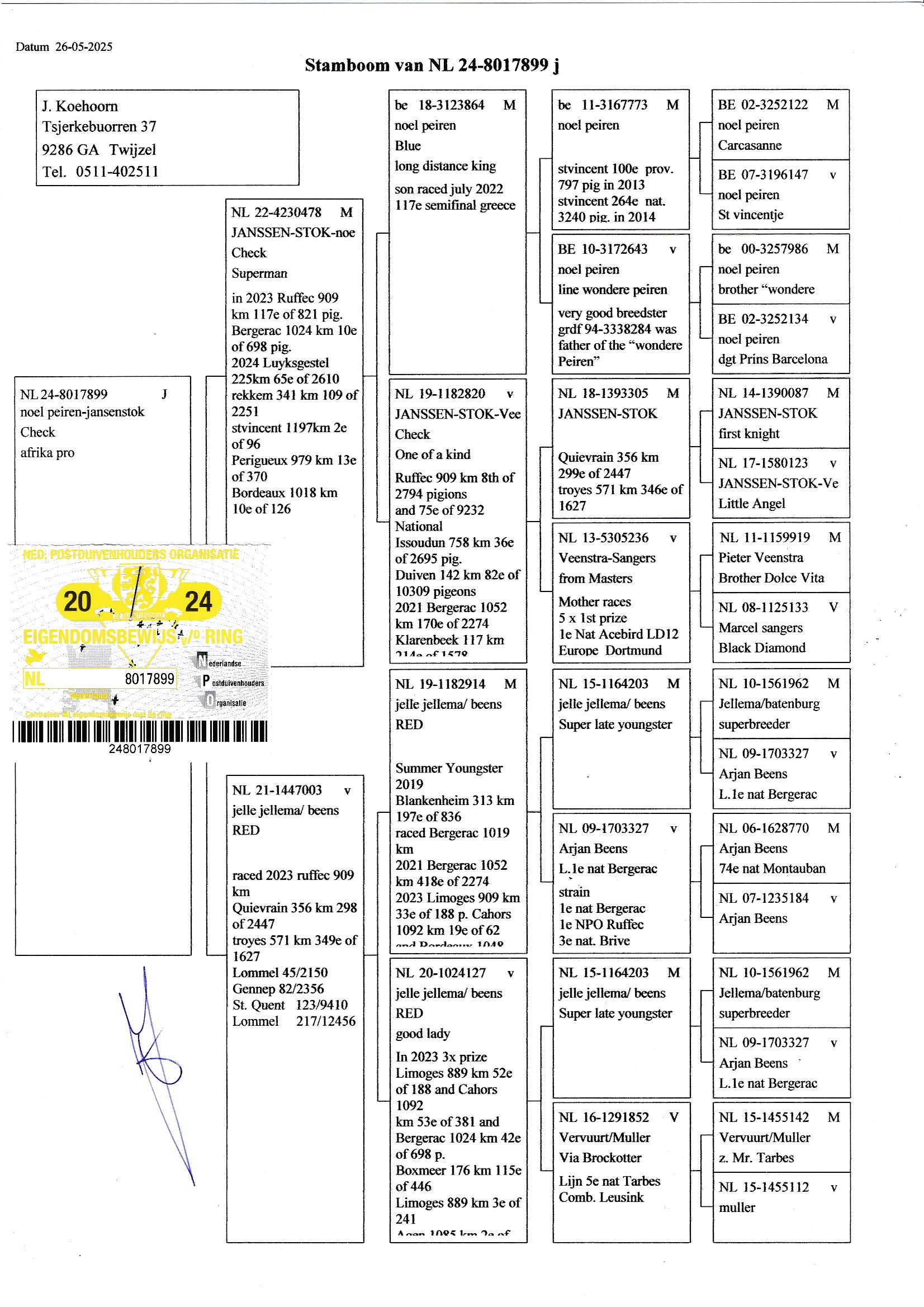 LOT 50 AFRIKAPRO AUCTION 1 – Tom van Gaver – Alberto Abajo BE-BE-24-4173256 -SIRE:BE 18-4070984 Charlie’s Star 984 Van Gaver&Geerinckx Blauw Witpen Father to: 1. Club 834 birds 7. Gen. 1.794 birds Orleans 2021 59. Nat 8.375 birds. Gueret 2022 21. N.Z. 5.148 birds Bourges 2022 1. fast 1.128 birds 21. Nat 24.006 birds 26. Fast 42791 birds. Bourges I 2024 6. Pr Ace KBDB LD 24 16 Best BE OLD LD 5p 18 Best BE OLD LD 4p 32. Nat Ace KBDB LD 43. Nat 3.157 birds Bergerac 2024 64. Nat 10.653 birds Limoges I 2024 86. Nat 6.889 birds. Limoges II 2024 145. Nat 4.673 birds Souillac 2024 1. loc 456 birds. 3. Comb 1.552 birds.————–DAM:20-4223055 Finn’s Fabian Elis Tom Van Gaver Zwart Mother to racers: 1. fast 1.128 birds 21. Nat 24.006 birds 26. Fast 42791 birds Bourges I 2024 6. Pr Ace KBDB LD 24 16 Best BE OLD LD 5p 18 Best BE OLD LD 4p 32. Nat Ace KBDB LD 43. Nat 3.157 birds Bergerac 2024 64. Nat 10.653 birds Limoges I 2024 86. Nat 6.889 birds Limoges II 2024 145. Nat 4.673 birds Souillac 2024 1. loc 456 birds. 3. Comb 1.552 birds Toury 2023.SEEPEDIGREE!!!