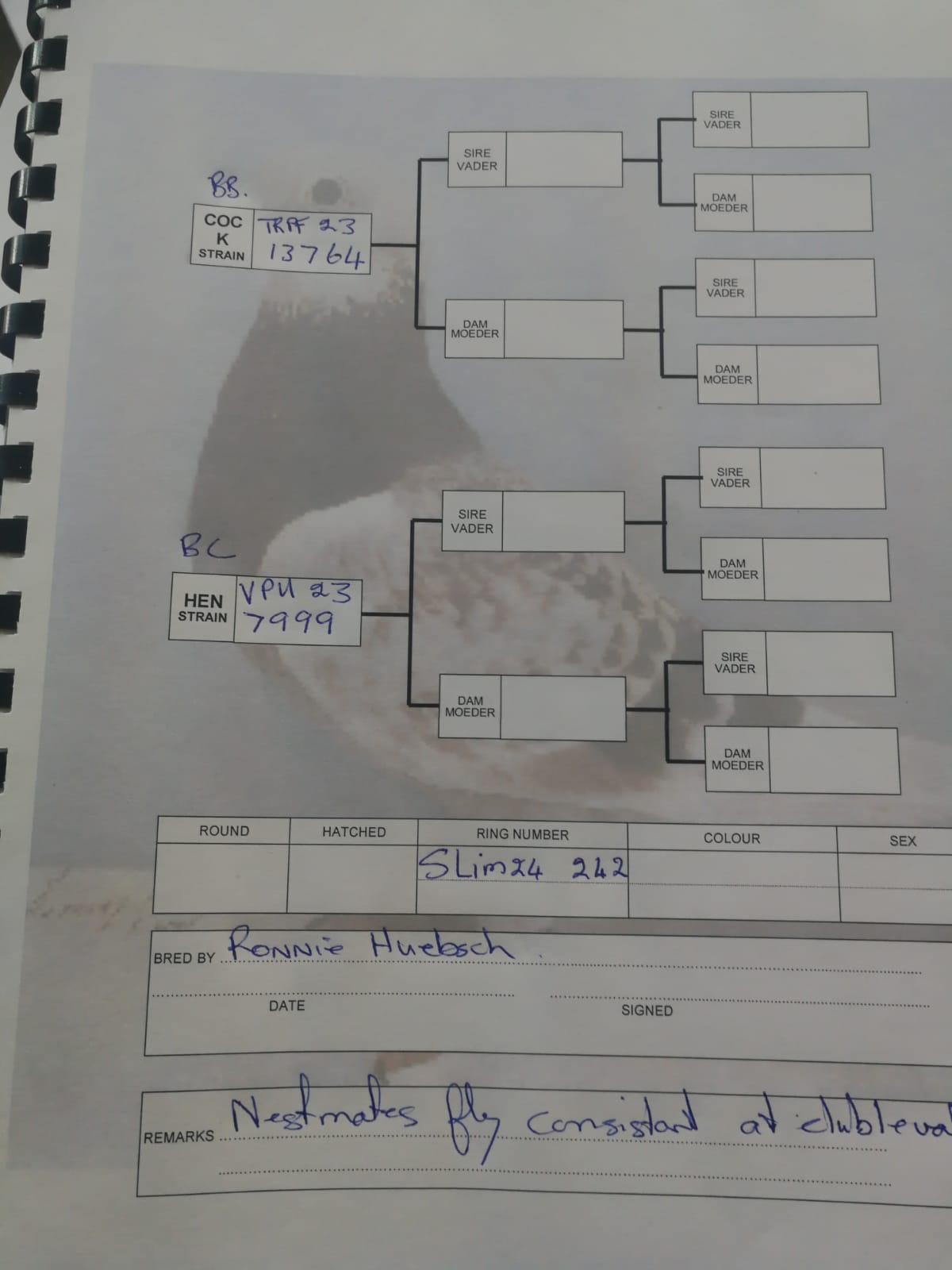 .LOT 6 MARLBANK OLR – JJJ VD LINDE & BANIE T2-ZA-24-GENE-242 –SIRE:ZA 18 BPFD 0371. 1ST FEDERATION 700KM. DIRECT SON TO FAMOUS “ROCKY”.————–DAM:0694 BPFD 18 . JJJ VAN DER LINDE. EQUAL WINNER SONSKYN FINAL RACE. DAM TO 2 X COMBINE WINNER. DAM TO JJJ’S NAVIGATOR BAKKIE WINNER BARCELONA DINOKENG OLR 2021. MISS NAVIGATOR BRED 2ND FINAL CARNIVAL SUMMER 2023.SEE PEDIGREE!!!