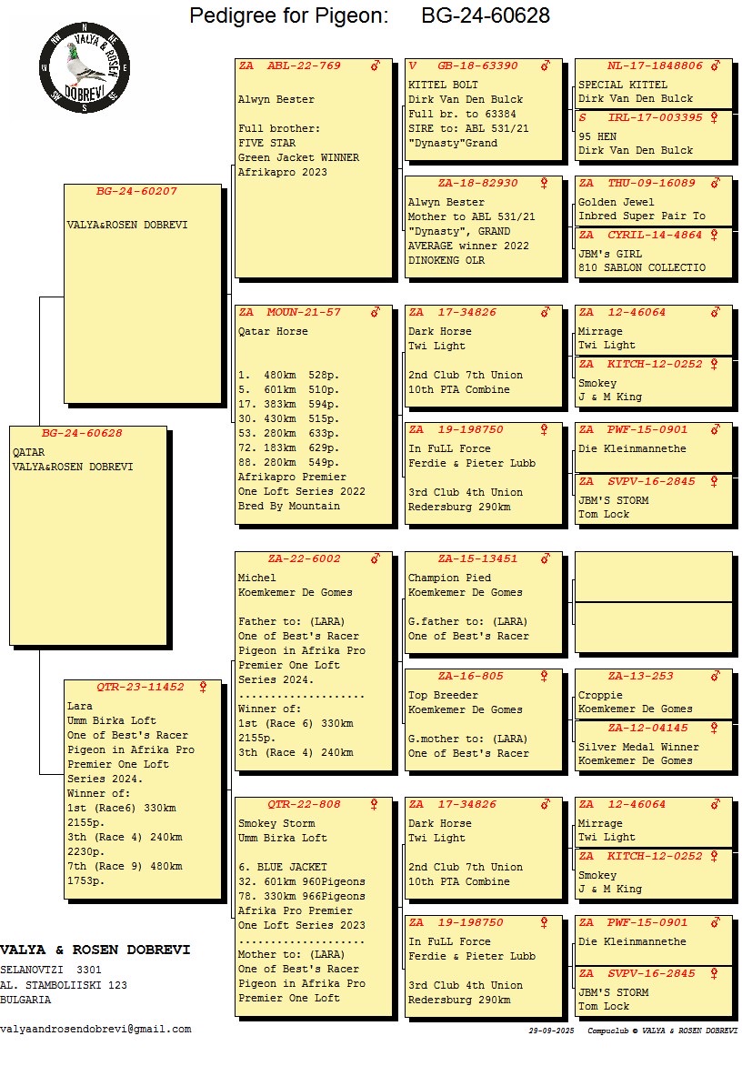 Z..LOT 115 AFRIKAPRO AUCTION 1 – Valya & Rosen Dobrevi-BULGARIA-24-60628 -SIRE:BG-24-60207. VALYA & ROSEN DOBREV. SIRE IS ZA 22 ABL 769 .Alias “BROTHER 5 STAR” Strain: ALWYN BESTER BROTHER “5 STAR” ZA22 ABL 769 FULL BROTHER TO: “5 STAR” GREEN JACKET WINNER AFRIKAPRO 2023 ZA21 ABL 343 “DYNASTY ” 1ST ACE DINOKENG OLR 2022 ZA21 ABL 344 PWDU UNION WINNER VERKEERDEVLEI 2020 & CRUSADERS BREEDERSTAKES R100,OOO WINNER..————-DAM:QTR-23-11452 “LARA”.Umm Birka Loft One of Best’s Racer Pigeon in Afrika Pro Premier One Loft Series 2024..Winner of: 1st (Race 6) 330km 2155p.3th (Race 4) 240km 2230p.7th (Race 9) 480km 1753p.SEE PEDIGREE!!!