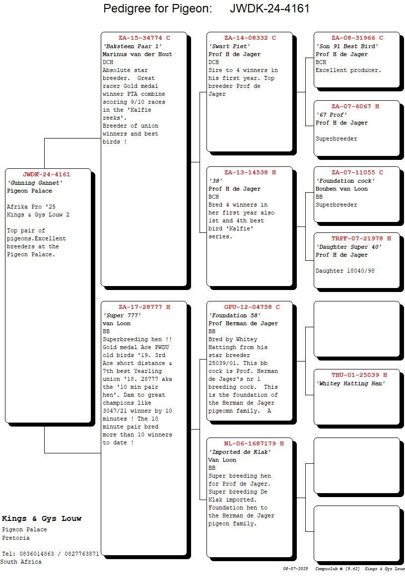 Z..LOT 129 AFRIKAPRO AUCTION 1 – Kings & Gys Louw 2-ZA-24-JWDK-4161 -SIRE:ZA 15 34774 “BAKSTEEN PAAR 1”. MARINUS VAN DER HOUT. ABSOLUTE STAR BREEDER. GREAT RACER. GOLD MEDAL WINNER PTA COMBINE SCORING 9/10 RACES IN THE “KALFIE REEKS”. BREEDER OF UNION WINNERS AND BEST BIRDS.———-DAM:ZA-17-28777 H ‘Super 777′ van Loon.Superbreeding hen !!! Gold medal Ace PWDU old birds ’19. 3rd Ace short distance & 7th best Yearling union 18. 28777 aka the ’10 min pair hen’. Dam to great champions like 3047/21 winner by 10 minutes! The 10 minute pair bred more than 10 winners to date!SEE PEDIGREE!!!