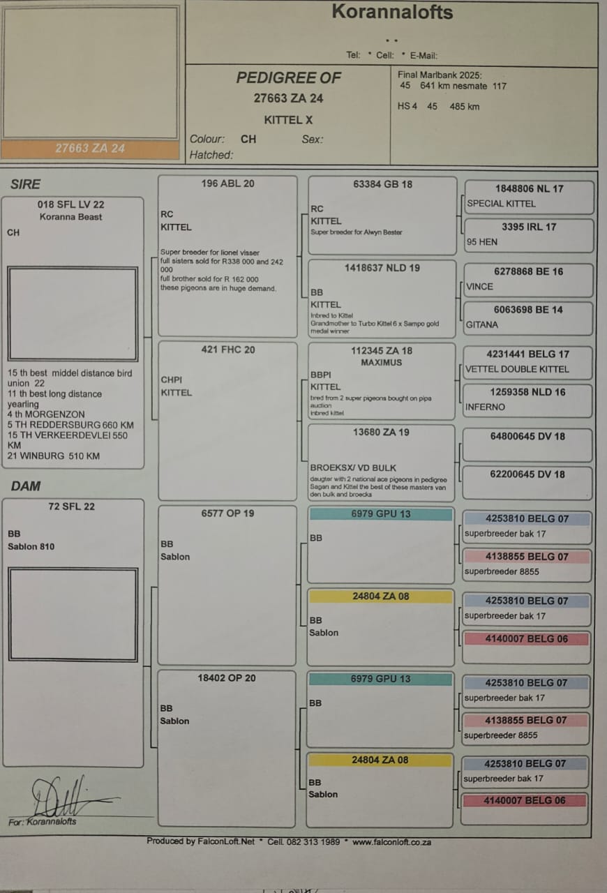.LOT 1 MARLBANK OLR – ALWYN BESTER T2-ZA-25-ABL-2003 -10TH RACE 3 , 8TH ACE BIRDBred from a half brother to sister mating from Blue Best Kittel on sire side and son from Blizzard King Kittel mated to a full sister to Blizzard King Kittel on dam side. 2003 8th Ace bird Marlbank OLR 2025, 24th Final Race Marlbank OLR 2025—————SIRE: 9106146 NLD 23 .Alias “DOUBLE BLUE BK” Strain: Dehon- Demonseau Color: Chequer Inbred half brother to sister back to BLUE BEST KITTEL. – Blue Best Kittel 1. Nat Acebird KBDB sprint 2021 4. Nat Acebird KBDB sprint 2019 Total 12 x winner of 1. -2. -3. against average 1200 birds.————-DAM: 3007903 BE 24.Alias “MISS GREY” Strain: VELGHE PIGEONS Color: Grizzle Exclusive inbred BLIZZARD KING KITTEL. Bred from a direct son of BLIZZARD KING KITTEL mated to a full sister of BLIZZARD KING KITTEL..SEE PEDIGREE!!!!