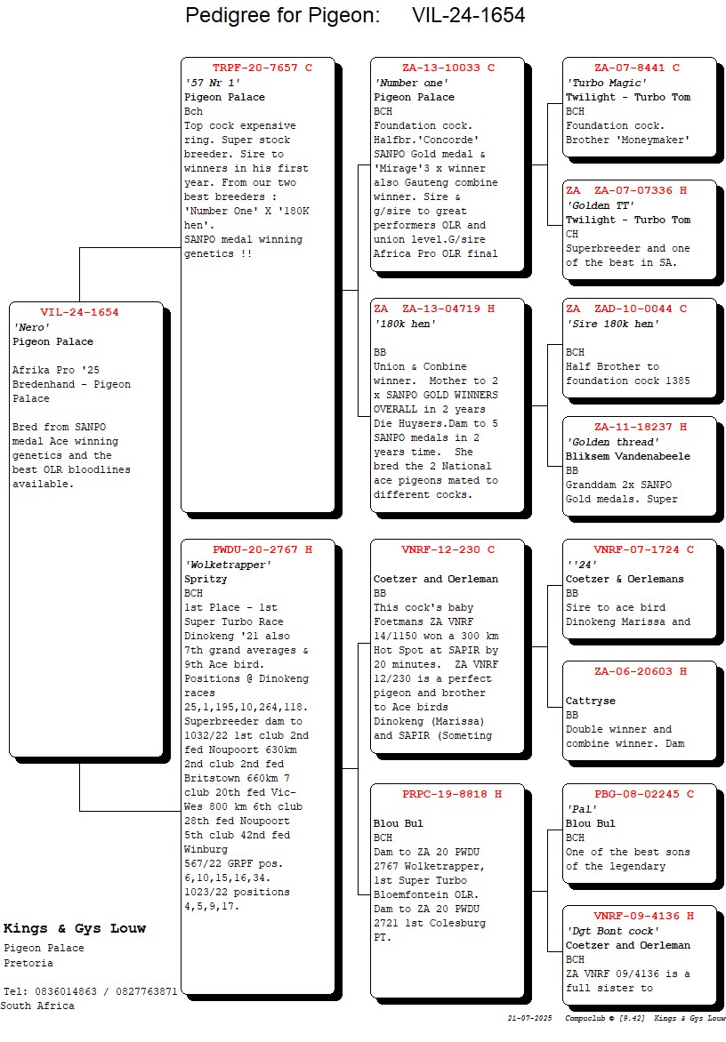LOT 86 AFRIKAPRO AUCTION 1 – Pigeon Palace 1-ZA-24-VIL-1631 -6TH BROWN JACKET AFTER RACE 9———Excellent performer at Afrika Pro ’25. Nestbrother “Fiero” 2nd Final Afrika Pro 25 601 km. Co-winner race 9 @ 500 km.Half sibling to ‘Lara’ phenomenal record breaking racing machine at Afrika Pro 2025. 1st Ace pigeon overall (Blue Jacket) 1st Ace pigeon long distance (Brown Jacket) 3rd final race 601. km 1150 mpm———– SIRE:ZAABL-24-1458 C ‘Palace Prince’ . Alwyn Bester bloodlines. Kittel-Di Caprio Mealy Pied Inbred to ‘Special Kittel’ and the ’95 hen’. Bred from a super performing family of pigeons..Sire to legendary ‘Lara’ phenomenal record breaking racing machine at Afrika Pro 2025. 1st Ace pigeon overall (Blue JACKET) 1st Ace pigeon long distance (Brown Jacket) 3rd final race 601 km 1150 mpm. ———-DAM:ZA-18-82875 H ‘Super Twilight’ Kings & Gys Louw. Super racer middle to long distance. Bred from a line of SANPO Gold medal winning pigeons. This hen’s first baby was a double winner 1st & 2nd union against more than 1500 pigeons. In her bloodline we find Gauteng combine winners and best birds. One of our top hens!SEE PEDIGREE!!!