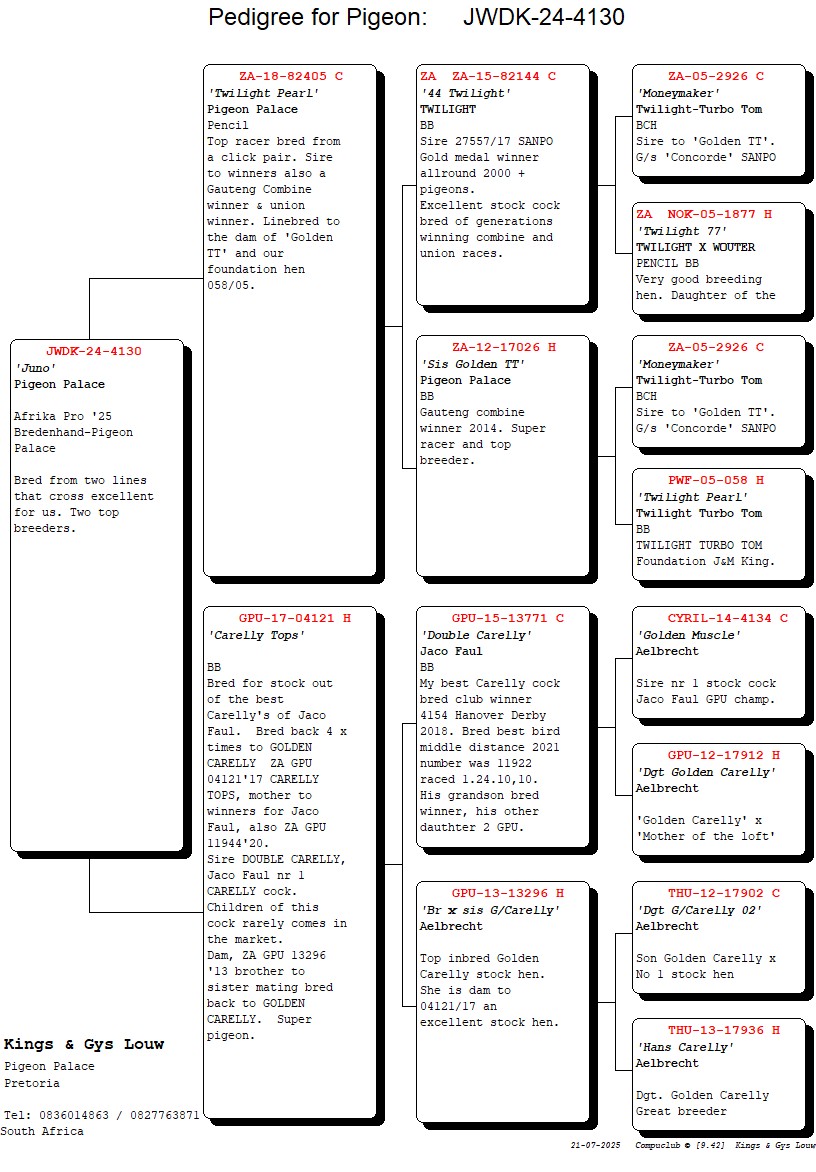 Z..LOT 141 AFRIKAPRO AUCTION 2 -Bredenhand – Pigeon Palace-ZA-24-JWDK-4130 -SIRE:ZA-18-82405 C ‘Twilight Pearl’ Pigeon Palace Pencil Top racer bred from a click pair. Sire to winners also a Gauteng Combine winner & union winner. Linebred to the dam of ‘Golden TT’ and our foundation hen 058/05.————DAM:ZA 17 GPU 04121 -Bred for stock out of the best CARELLY’S of Jaco Faul. Bred back 4 x times to GOLDEN CARELLY. ZA GPU 04121 ’17 CARELLY TOPS, mother to winners for Jaco Faul, also ZA GPU 11944 ’20. Sire, DOUBLE CARELLY, Jaco Faul nr 1 CARELLY cock. Children of this cock rarely comes in the market. Dam, ZA GPU 13296 ’13 brother to sister mating bred back to GOLDEN CARELLY. Super pigeon.SEE PEDIGREE!!!