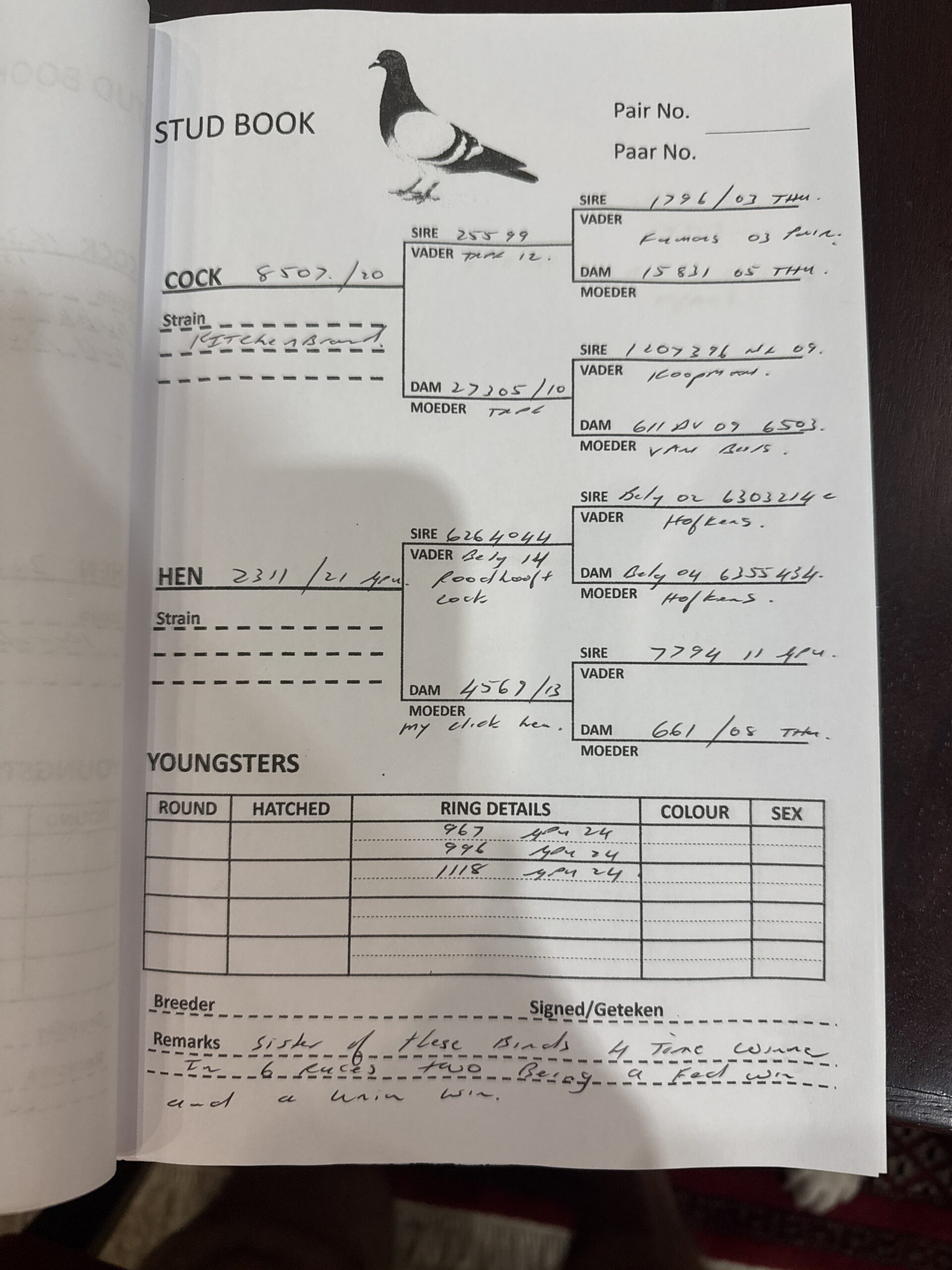 Z..LOT 105 AFRIKAPRO AUCTION 2 -Velghe/Deetlefs/Du Preez 2-BE-24-3108146 -SIRE:82937 ZA 18.Du Preez&Deetlefs BRED FOR STOCK BRED WINNERS DAUGHTER 20-10077 3 X WINNER SUPER BRED COCK.——-DAM:01732 ZA 16 LADY Colour: BB TOENIER/CATRRYS/HERMANS/PUTT.BRED WINNERS 4X WINNER 3XUNION WINNER 2X COMBINE WINNER 2ND BEST BIRD COMBINE BEST OLD BIRD COMBINE 3 BEST SHORT DISTANCE COMBINE.SEE PEDIGREE!!!!