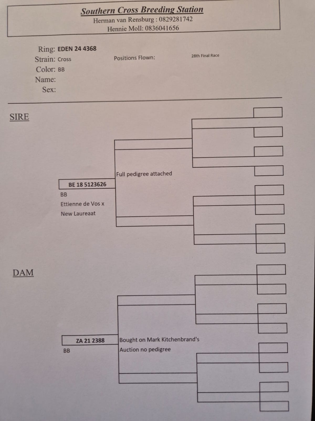 LOT 24 CARNIVAL LOFTS OLR – Protea Hokke-TRPF 24 4212 -13TH FINAL———-SIRE:ZA-2018-TRPF-10381 Mc Dermott Lofts Checkered Father to: • 13e Final Carnival Winter 2025. His full sister is mother to “Afrique” • 1e Race 6 Afrika Pro Series 2025. (for JP Cilliers and Hein Beneke) ============DAM:ZA-2018-TRPF-8008 Mc Dermott Lofts.Blue white flights Blue white flights Strain: Van Elsacker Silvano Flor Engels She flew like a machine in the GRPF. • 2e Ace Bird in the GRPF. • 1e Club 8e Fed Springfontein. • 2e Club 10e Fed Winburg. • 2e Club 30e Fed Tierpoort. • 2e Club 4e Fed Jamestown. • 3e Club 20e Fed Trompsburg. • 4e Club 39e Fed Leeu Gamka. • 5e Club 42e Fed Richmond. • 5e Club 39e Fed Aliwal North. • 7e Club 69e Fed Noupoort. • 11e Club 143e Fed Colesburg. • 13e Club 54e Fed Three sisters.SEE PEDIGREE!!!
