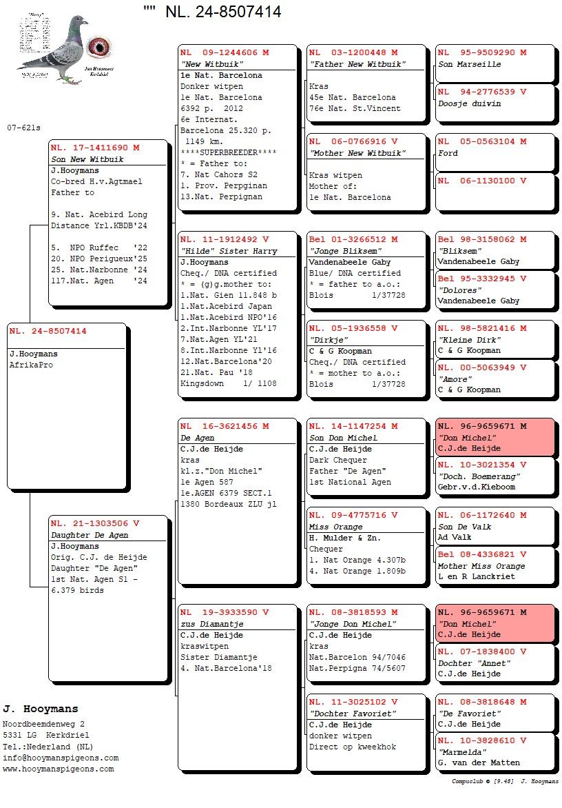 ZZ..LOT 101 AFRIKAPRO AUCTION 4-Team Hooymans – II-NL-24-8507414 -SIRE:17-1411690 M Son New Witbuik J.Hooymans Co-bred H.v.Agtmael Father to 9. Nat. Acebird Long Distance Yrl.KBDB’24.———-DAM: NL. 21-1303506 V Daughter De Agen J.Hooymans Orig. C.J. de Heijde Daughter “De Agen” 1st Nat. Agen S1 – 6.379 birds.SEE PEDIGREE!!!