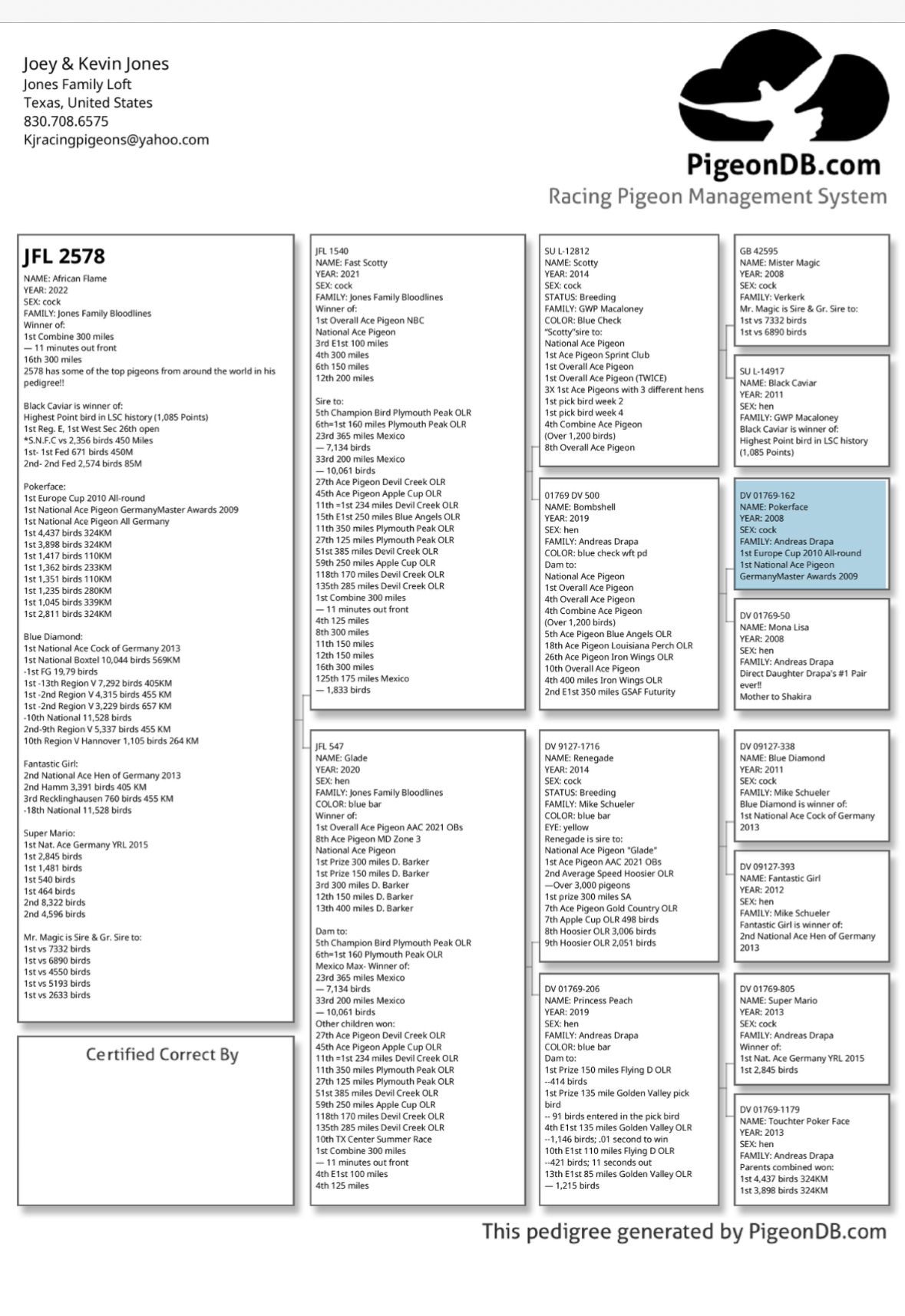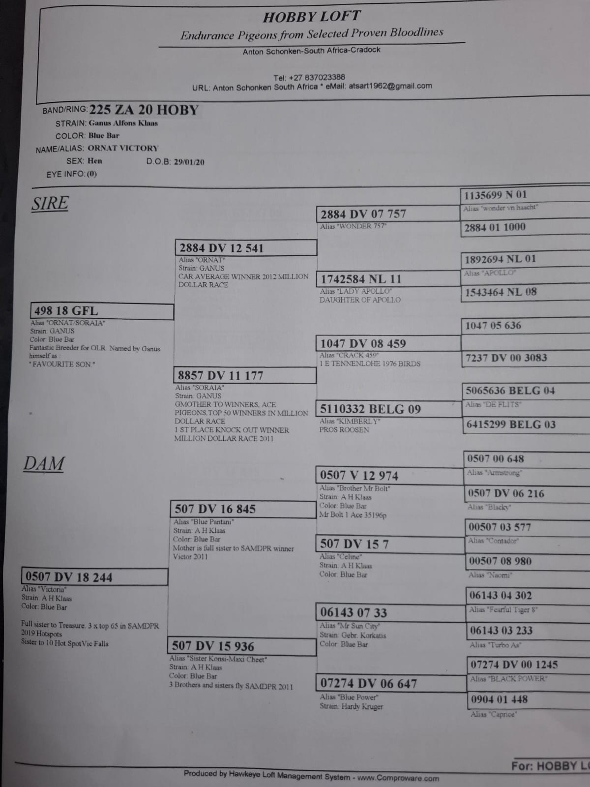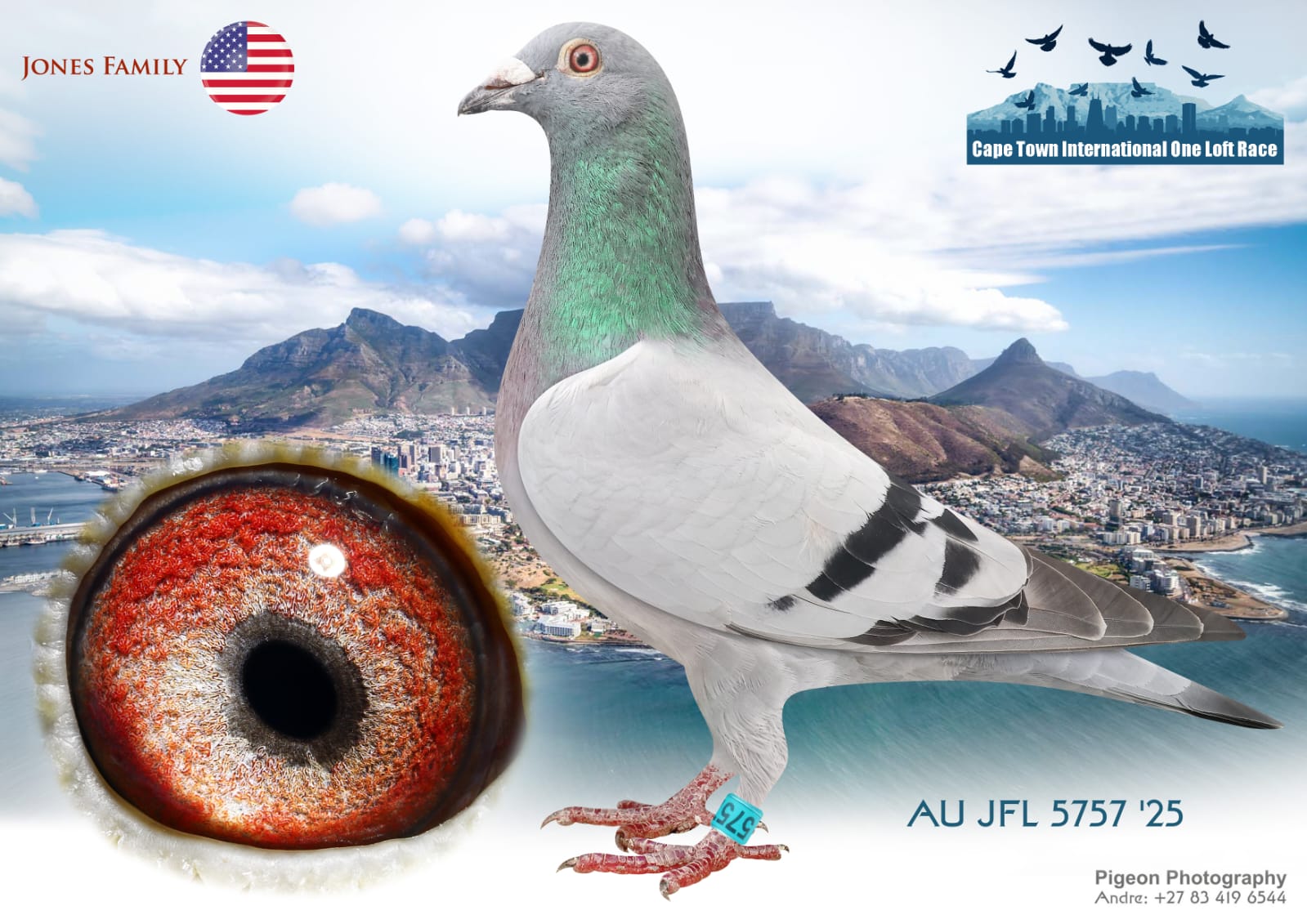 ZZ..LOT 104 CAPETOWN LOFTS – Jones Family-ZA-JFL-25-5757″””—“INJURED” DID NOT GO TO THE FINAL—SIRE:ZA 22 JFL 2578. JONES FAMILY BLOODLINES. 1ST COMBINE 300 MILES. BRED FROM SUPER GENETICS AROUND THE WORLD.————DAM:225 ZA 20 HOBY. GANUS/ALFONS KLAAS. SIRE IS BRED DIRECTLY OUT OF SUPER PAIR “ORNAT” AND “SOARAIA”.SEE PEDIGREE!!!!