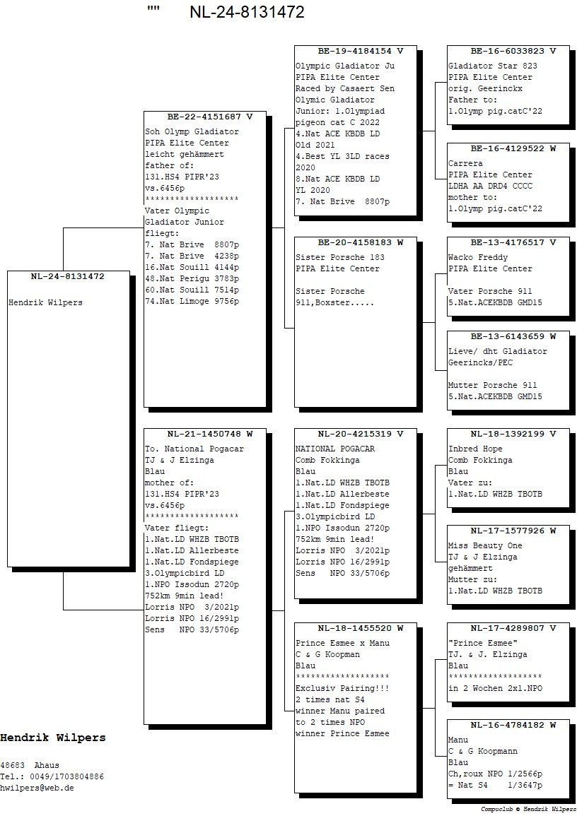 LOT 19 AfrikaPro Auction 2B – Team Van Oss – NL-24-8627728 -RACE 1 EQUAL WINNER , RACE 2 EQUAL WINNER , RACE 3 EQUAL WINNER———-SIRE:NL 22-8562721 M.Team van Oss blue.SIRE IS NL. 16-1663927 M Son Roney J.Hooymans.————DAM:NL 23-9173244 V.R.A. Bakker & Zn. DAM IS 21-1032912 V “GERMINY’S DREAM” R.A. Bakker & Zn Kras 2nd price winner NPO La Ferte St Aubin against 4435 p. Winner PIPA ranking combined Middle- en OLD races & 9th price winner PIPA ranking 2022 OLD.SEE PEDIGREE!!!