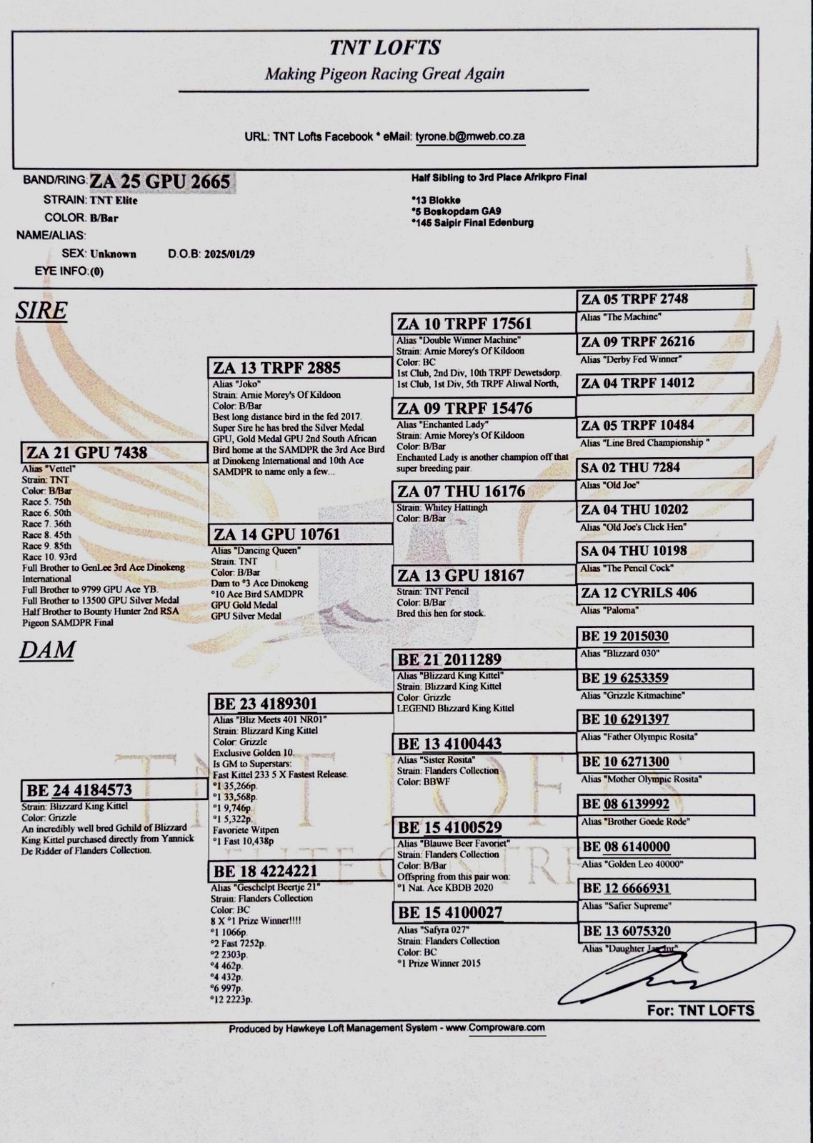 ZZ..LOT 112 SAIPR SUMMER AUCTION 1 –TNT Elite Centre 2- GPU 2665 2025 -HALF SIBLING TO 3RD AFRIKAPRO FINAL———SIRE:ZA 21 GPU 7438.Full Brother to GenLee 3rd Ace Dinokeng. Full Brother to 9799 GPU Ace YB. Full Brother to 13500 GPU Silver Medal .Half Brother to Bounty Hunter 2nd RSA Pigeon SAMDPR Final.————DAM:BE 24 4184573 Strain. Blizzard King Kittel Color: Grizzle.An incredibly well bred Gchild of Blizzard King Kittel purchased directly from Yannick De Ridder of Flanders Collection.SEE PEDIGREE!!!
