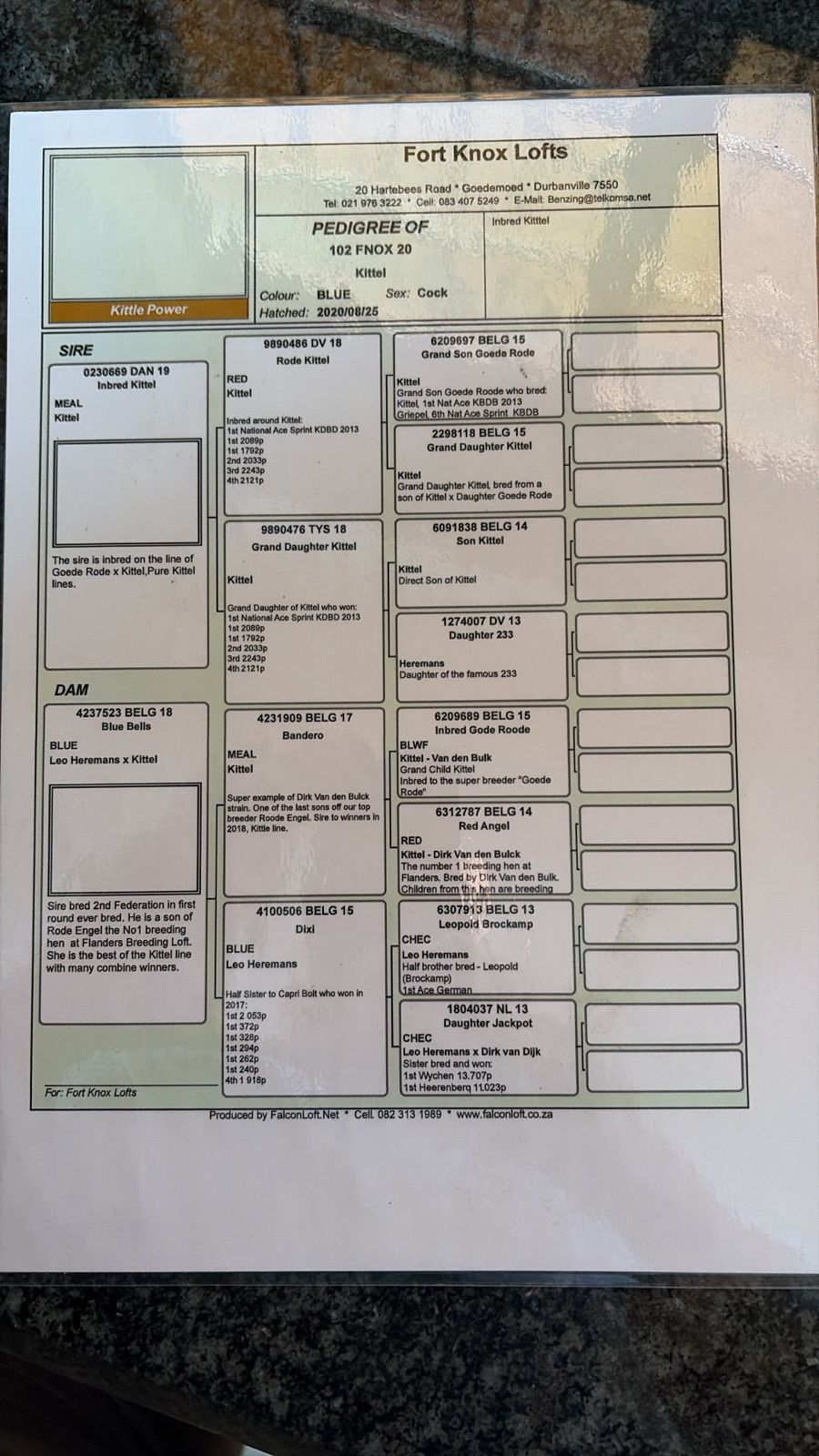 ZZ..LOT 114 SAIPR SUMMER AUCTION 1 –JW Lofts & Andreas Mengewein 2- HPU 8410 2025 -SIRE:ZA 102 FNOX 20. KITTEL.SIRE IS INBRED KITTEL . The sire is inbred on the line of Goede Rode x Kittel,Pure Kittel lines.—————DAM:ZA 18 GPU 14538.BOUGHT FOR R19 500.00 ON TOPPIGEON. THIS IS A DIRECT DAUGHTER TO FAMOUS “OSWALLY” SHE WON DINOKENG OLR FINAL.SEE PEDIGREE!!!