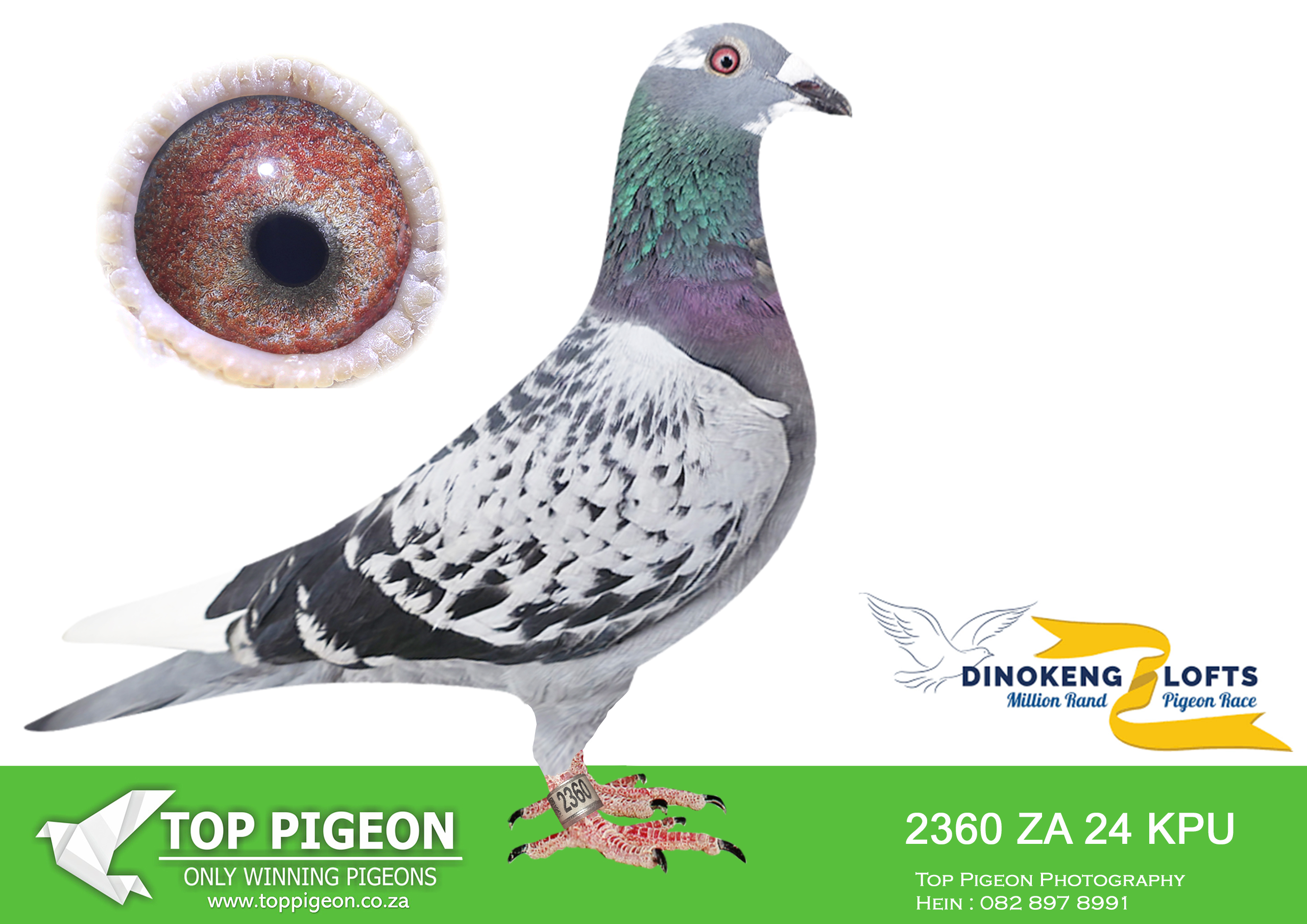 ZZ..LOT 115 DINOKENG OLR AUCTION 2 – DIE PAINTERS-ZA KPU 24- 2360 -This beautiful Pied Hen is a full sister of “SHEWASDU 2 WIN”. She attained one of our most cherished achievements during our career in pigeon racing by winning the Green Jacket Series at Afrikapro 2024 against close on 3000 of the world’s best pigeons. Directly out of “BAKBEEN’ our 1st Ace Pigeon Sprints in the Union. This cock is also a great breeder and father to 2 super racers during 2023. The mother is a direct Arie Dijkstra bought by our partner Simon Ullrich afte, being handpicked by us when she was available after Afrikapro 2023. The outstanding feature of this hen is her super-soft & silky feathering. She ranks amongst the very best as far as this trait is concerned – as all champion fanciers know, this is a true sign of excellence!SEE PEDIGREE!!!