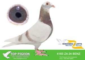LOT 51 DINOKENG AUCTION 2 – COBUS & GYS LOUW-ZA BENZ 24- 3670 (B) -SIRE:ZA 20 TRPF 7712. SUPER SON “NUMBER ONE”.BROTHERS AND SISTERS ARE FANTASTIC RACERS AND BREEDERS. TOP RACERS ARGUABLY ONE OF THE BEST BRED FROM THIS PAIR. NOW AT STOCK. HIS FIRST BABY WON. THIS COCK WILL FOLLOW IN HIS FATHER’S FOOTSTEPS. SUPER PIGEONS TOP OF THE LIST.——–DAM: ZA 21 ABL 368 “ABL KITTEL”. HALF SISTER TO MOTHER OF SANPO GOLD MEDAL WINNER 2021 ALLROUND “TURBO KITTEL”. INBRED TO FAMOUS KITTEL 1ST NATIONAL ACE KBDB 2013. THIS HEN IS DAM TO A SUPER RACER AND WINNER FOR GYS & FORMYN IN THE STRONG TRPF. SEE PEDIGREE!!!