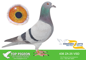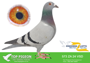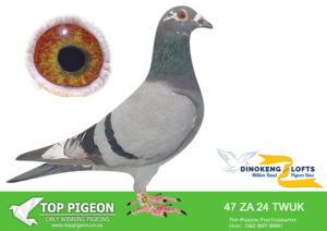 LOT 57 DINOKENG AUCTION 2 – BOTHA LOFTS-ZA CRU 24- 2015 -SAME BRED SOLD FOR R33 000.00 ON TOPPIGEON—-SIRE:1782 ZACRU 21. DU PREEZ & DEETLEFS.(SIRE AND DAM SOLD FOR R580 000.00) THIS COCK IS A FULL BROTHER TO TURBO KITTEL OF BARNIE AND JOHN.TURBO KITTEL WAS THE BEST PIGEON IN SA WINNING 8 SANPO GOLD MEDALS. ——–DAM:1502 ZA CRU 21.BRED FOR STOCK. THIS IS BRED OUT OF “HOPE” . “HOPE HAS WON THE BAKKIE RACE DINOKENG 2020.SEE PEDIGREE!!