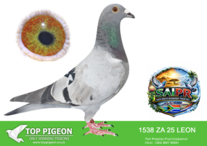 LOT 40 SAIPR SUMMER AUCTION 1 – Klerksdorp Racers 1- LEON 1542 2025 -12th Place Finale SAIPR Summer race 2026 and co-winner of Champion of Champions SAIPR Winter and Summer race 2025/26. Bred out of SAIPR WINNER 2024 winner of R750,000 and Johny”s- Best Kittel line.—————-SIRE:NRHU 23 4070.Strain: Best Kittel X Meyers Color: Grizzel Father to 12 Place Finale SAIPR Summer 2026.Strong build cock————-DAM:LEON 23 1188 Alias “Top Gun” Strain: Ganus X Meyers Color: B/bar BIG WINNER R750,000 !!!!!!!! In a hard race with a velocity of 1007 m/min This Super Hen TOP GUN is the 1st Price Winner at SAIPR 2024 Winter Race and win us R750,000 in pricemoney.Brother Bullet 1234 2nd ACE Pigeon SAIPR 2024. SEE PEDIGREE!!!!
