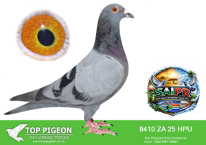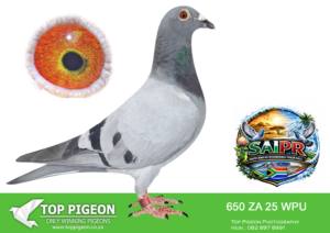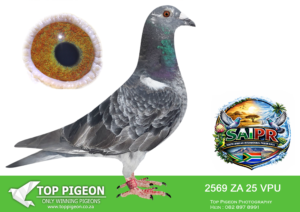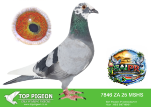 LOT 23 SAIPR SUMMER AUCTION 1 – Theuns Victor- VICTOR 108 2025 -4TH FINAL WINNING R90 000.00——-SIRE:483 ZA 19 OOA .Alias “MR WOW” Strain: Tom Lock/Sablon Color: Blue Bar SUPER RACER 8 WEEKS IN A ROW FOR OOA LOFTS!! 7th Club, 18th VPU, Glen, Y/B, 286km, 1369mpm – 1993 pigeons 11th Club, 47th VPU, Tom’s Place, Y/B, 323km, 1416mpm – 2113 pigeons 49th Club, 152nd VPU, Springfontein, Y/B, 424km, 1014mpm————DAM:6493 ZA 21 KUR.Strain: Sablon/Tom Lock Color: Blue Bar.SEE PEDIGREE!!!!