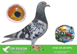 LOT 18 SAIPR SUMMER AUCTION 1 – Gerrie Maritz- PSWU 4115 2025*** -CHALLENGE RACE WINNER WINNING R40 000.00– he scored 18 the on the final race after he was performing for his race rivals chasing them in until he finally walked in. He resembles the Sierens pigeons of the late Andre Carelse.————SIRE:90869 ZA 18 .Alias “”69″” Strain: OSCAR SIERRENS Color: Blue Check Pied BRED OUT OF THE BEST OSCAR SIERENS LINE IN SA R50 000 PAIR.————DAM:276610 PSWU 20.Alias “Combine Champ” Color: Blue Bar What a Champion , 3 x winner , Combine winner , Best pigeon in 2024 PSWU Combine. She flew in 16 races to become best bird in the Combine. Bred by Louwtjie Fourie ,champion fancier , I bought this hen on the yearling sales …. she won on all races short to the very longest of the season.SEE PEDIGREE!!!!