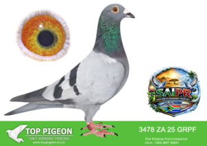 LOT 52 SAIPR SUMMER AUCTION 1 – Greg Anderson 2- GRPF 3491 2025 -SIRE:ZA 24 BENZ 5755 -‘Mealy Kittel’ Pigeon Palace Mealy Top Kittel cock and a grandson to ‘Kitty Gold Dust’ double granddaughter to the best sister in the world of ‘Kittel’ 1st National Ace KBDB. Also grandson to ‘Double Combine’ sire to ‘Julia’ winner Afrika Pro final 22 600km in the heat. His dam is a halfsister to SANPO Gold medal winner 2019 allround 2000+pigeons.————-DAM:368 TRPF 24 Harry Wilson BLUE 5TH Ace bird SAIPR summer 2025. 10th final SAIPR summer 2025. 27th hotspot 4 SAIPR summer 2025. 125th hotspot 3 SAIPR summer 2025. 11th hotspot 2 SAIPR summer 2025.SEE PEDIGREE!!!