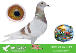LOT 25 SAIPR SUMMER AUCTION 1 – Gerrie Maritz- PSWU 4113 2025 -11TH FINAL RACE WINNING R20 000.00 , 5TH ACE BIRD , HOTSPOT 3 WINNER WINNING R25 000.00 , 9TH HOTSPOT 4—-Her nestsister was 2nd on Hotspot 3. 1st and 2nd in one nest!———SIRE:126 ZA 22 HHH.Alias “‘ Mr Body seun ‘” Strain: HENDRIK HUYSER Color: Blue Bar Bred from 2 super Pigeons ……the best Sanpo Gold genetics. Look at the pedigree…..Hendrik Huyser and Kings and Gys Louw. Champion fanciers with super pigeons.————DAM:96222 ZA 18 .Alias “”222″” Strain: De Rauw Sablon Color: Blue Bar One of my best racing hens over 3 seasons, a banker. From the first year in the the breeding loft her babies scored. Bred from my proven Sablon lines. See her pedigree.SEE PEDIGREE!!!!