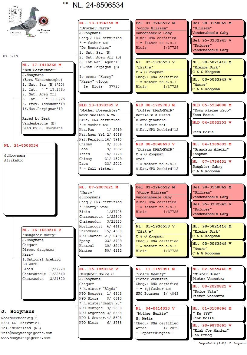 ZZ..LOT 118 AFRIKAPRO AUCTION 3 -Jan Hooymans I-NL-24-8506534 -SIRE:NL. 17-1410366 M “Den Boswachter” J.Hooymans (Bert Vandenberghe) 1. Nat. Pau (B) (’20) 2. Int. 13176P 2. Nat. Agen Yrl 6. Int. 11572P.————–DAM:NL. 16-1663510 V “Daughter Harry”. J HOOYMANS.Direct daughter “HARRY”.1. National Acebird LD WHZB.SEE PEDIGREE!!!