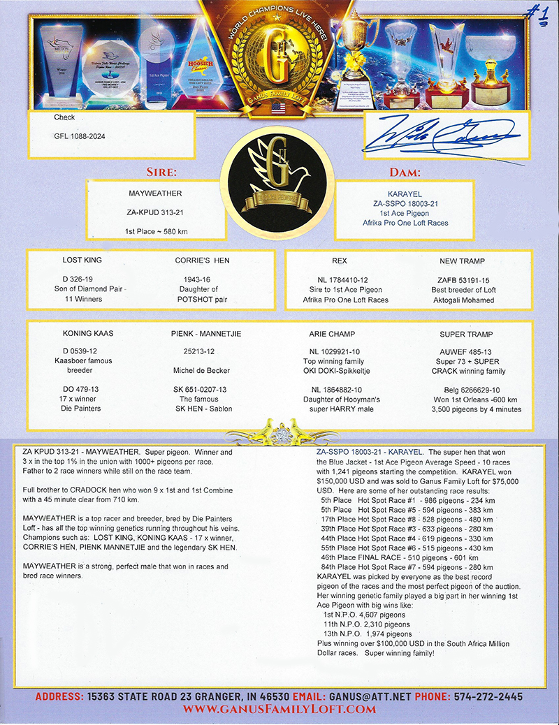 ZZ..LOT 118 AFRIKAPRO AUCTION 4-Ganus Family Loft 3-AU-24-GFL-1088 –