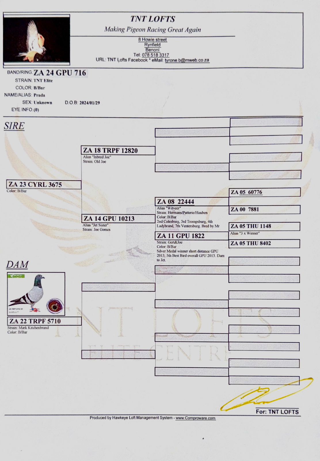 .LOT 2 AFRIKAPRO AUCTION 5 – Hok Reijnen-BE-24-3106793 -SIRE:NL 22-8542499 M Golden Basic Boy Reijnen-Bolton-Hoogh Donker Geschelpt 1/2 Broth.25-6050979 Acepigeon Overall.————–DAM:GRPF-22-1046 V.PIGEON PALACE.DAM IS 18-82875 V “Super Twilight” Kings & Gijs Louw BCH Super racer middle to long distance. Bred from a line of SANPO Gold medal winning pigeons. Tis hen’s first baby was a double winner 1st & 2nd union against more than 1500 pigeons.SEE PEDIGREE!!!!