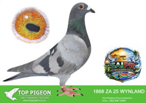 LOT 23 SAIPR SUMMER AUCTION 1 – Theuns Victor- VICTOR 108 2025 -4TH FINAL WINNING R90 000.00——-SIRE:483 ZA 19 OOA .Alias “MR WOW” Strain: Tom Lock/Sablon Color: Blue Bar SUPER RACER 8 WEEKS IN A ROW FOR OOA LOFTS!! 7th Club, 18th VPU, Glen, Y/B, 286km, 1369mpm – 1993 pigeons 11th Club, 47th VPU, Tom’s Place, Y/B, 323km, 1416mpm – 2113 pigeons 49th Club, 152nd VPU, Springfontein, Y/B, 424km, 1014mpm————DAM:6493 ZA 21 KUR.Strain: Sablon/Tom Lock Color: Blue Bar.SEE PEDIGREE!!!!