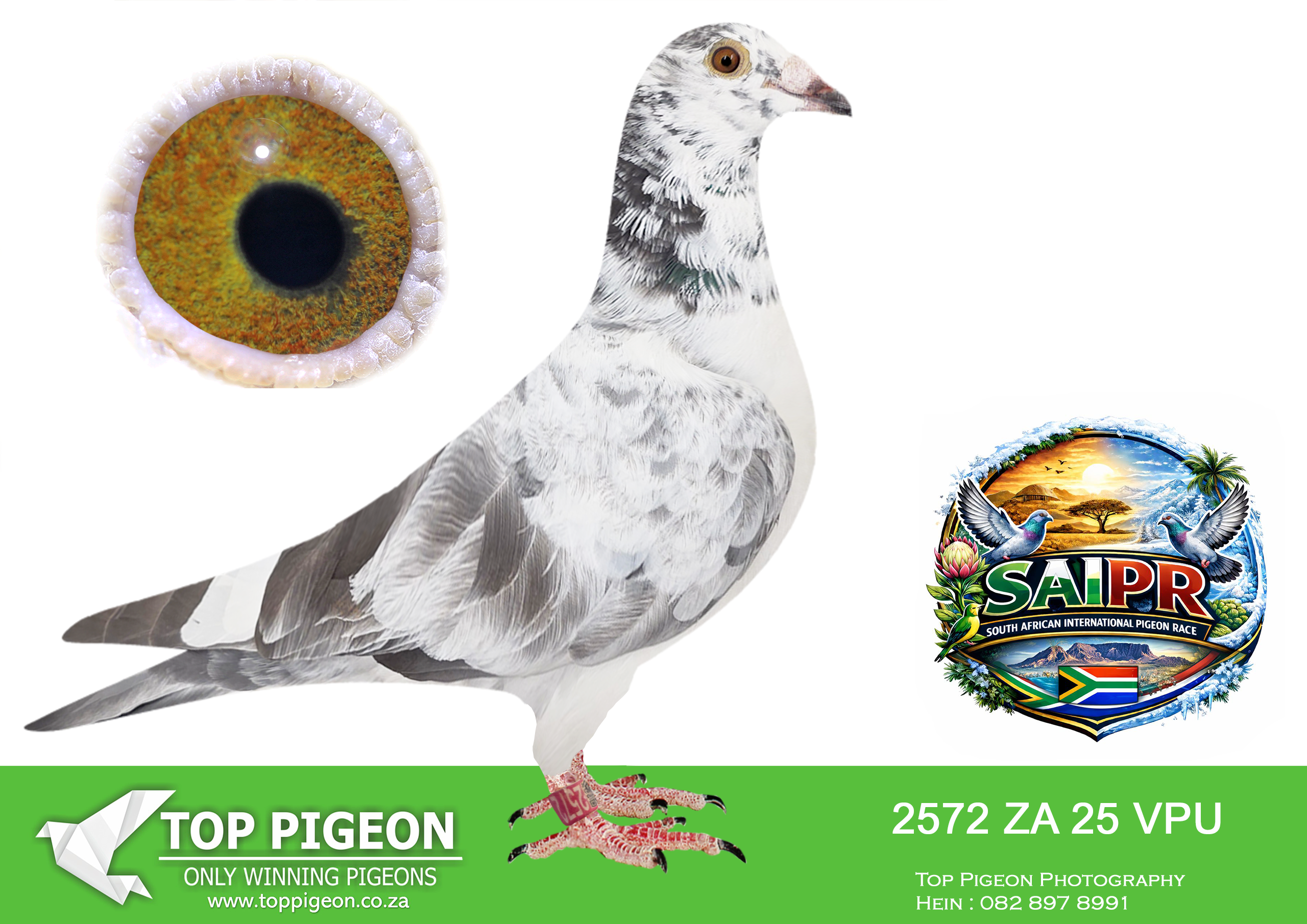 LOT 24 SAIPR SUMMER AUCTION 1 – Theuns Victor- VICTOR 107 2025 -9th Final Race WINNING R30 000.00——–SIRE:483 ZA 19 OOA .Alias “MR WOW” Strain: Tom Lock/Sablon Color: Blue Bar SUPER RACER 8 WEEKS IN A ROW FOR OOA LOFTS!! 7th Club, 18th VPU, Glen, Y/B, 286km, 1369mpm – 1993 pigeons 11th Club, 47th VPU, Tom’s Place, Y/B, 323km, 1416mpm – 2113 pigeons 49th Club, 152nd VPU, Springfontein, Y/B, 424km, 1014mpm————DAM:6493 ZA 21 KUR.Strain: Sablon/Tom Lock Color: Blue Bar.SEE PEDIGREE!!!!
