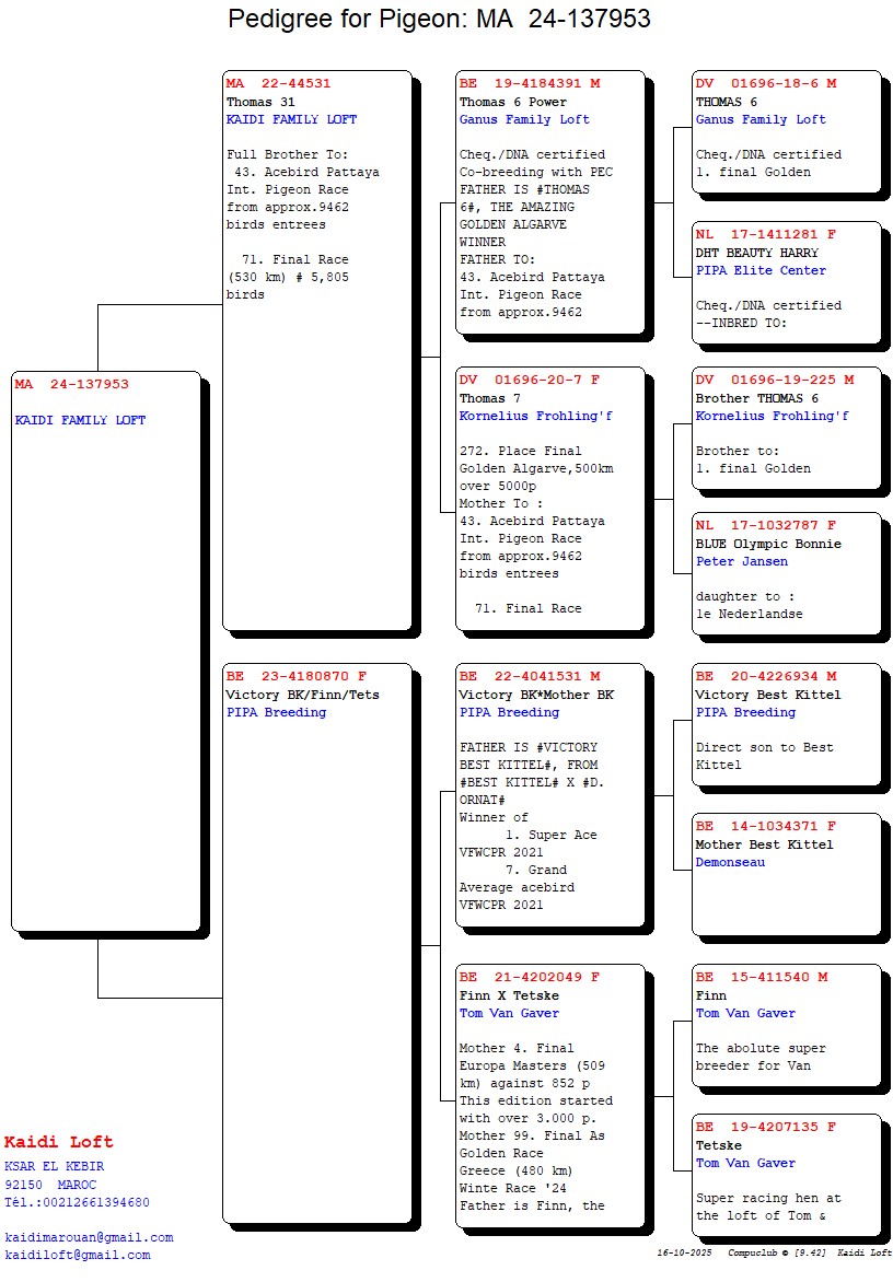 LOT 49 AFRIKAPRO AUCTION 5 – Kaidi Family Loft-MAROC-24-137781 -SIRE:BE 23-4181826 M GUSTAVE-BLUE BK-GOLD PIPA Breeding Father is Olympic Gustave XIV SUPER RACER! Unique performer with the lowest % ever Olympiad Sprint Belgium, winning: 1. Olympiad Belgium Cat. A ’24 1. Nat. Ace KBDB Sprint 2023 6. Nat. Ace KBDB Sprint 2022 (Behind 1.-2.-3.-4. Nat. Ace KBDB Sprint with BK family) Winner of 14(!) X 1. against av. +1.000.———DAM:AU GFL-20-1006 F Mike 6 Ganus Family Loft 173. Place Final Golden Algarve,500km over 5000p Full Sister to: 29. Place Final Golden Algarve,500km over 5000p The Best Blood for One Loft Race all over the World.SEE PEDIGREE!!!