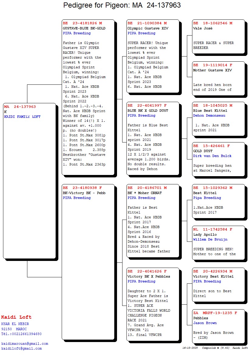 LOT 49 AFRIKAPRO AUCTION 5 – Kaidi Family Loft-MAROC-24-137781 -SIRE:BE 23-4181826 M GUSTAVE-BLUE BK-GOLD PIPA Breeding Father is Olympic Gustave XIV SUPER RACER! Unique performer with the lowest % ever Olympiad Sprint Belgium, winning: 1. Olympiad Belgium Cat. A ’24 1. Nat. Ace KBDB Sprint 2023 6. Nat. Ace KBDB Sprint 2022 (Behind 1.-2.-3.-4. Nat. Ace KBDB Sprint with BK family) Winner of 14(!) X 1. against av. +1.000.———DAM:AU GFL-20-1006 F Mike 6 Ganus Family Loft 173. Place Final Golden Algarve,500km over 5000p Full Sister to: 29. Place Final Golden Algarve,500km over 5000p The Best Blood for One Loft Race all over the World.SEE PEDIGREE!!!