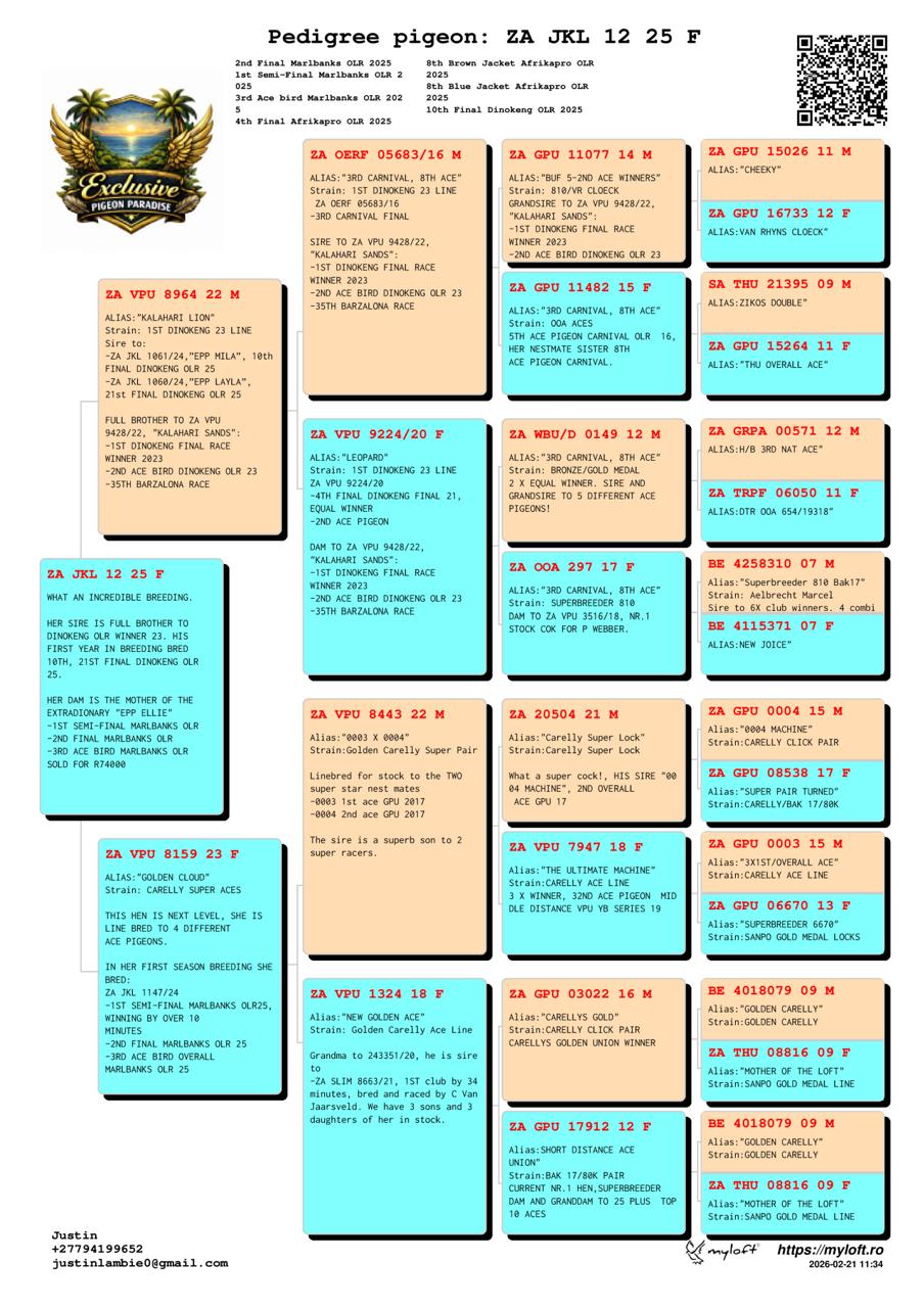 ZZ..LOT 136 SAIPR SUMMER AUCTION 1 –Exclusive Pigeon Paradise 2- JKL 12 2025 -SIRE: ZA VPU 8964/22, “KALAHARI LION” SIRE TO: -ZA JKL 1061 “EPP MILA”, 10TH DINOKENG FINAL 2025. -ZA JKL 1060 “EPP LAYLA”, 21ST DINOKENG FINAL 2025. -ZA JKL 1063 “EPP ELLA”, 41ST MARLBANKS FINAL.————DAM:ZA VPU-23-8159 H GOLDEN CLOUD GOLDEN CARELLY Blue Bar NEXT LEVEL. LINEBRED TO 4 DIFFERENT ACE PIGEONS FROM OUR GOLDEN CARELLY X 08816 SUPER PAIR.MOTHER OF “EPP ELLIE”, ENTERED AT MARLBANKS OLR 2025 -3RD ACE BIRD -2ND RICHMOND FINAL 1103MPM -1ST HANOVER 1289MPM, SHE WON BY OVER 9 MINUTES. SHE WON COMBINE SAME WEEKEND AGAINST +/-8000 PIGEONS.SEE PEDIGREE!!!