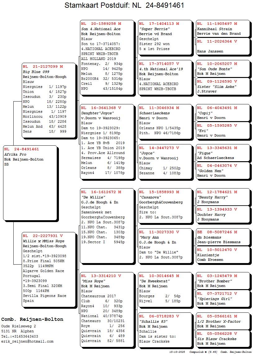 LOT 22 AFRIKAPRO AUCTION 4 – PIGEON24-BE-25-6013034 -SIRE:BE 19-6015774 M Crayoné Boy Geerinckx Bart.Direct Son to: ”Smart Boy” 1st prov.acebird LD ”Sweety” Olympic pigeon.————DAM:MRPF-19-1226 V.Jason Brown Geschelpt Witpen 6. Super Ace Victoria Falls WCPR 2020.SEE PEDIGREE!!!!