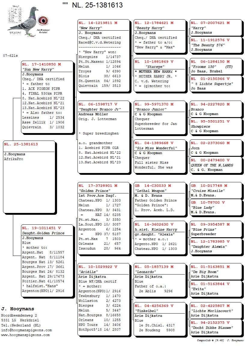 ZZ..LOT 141 AFRIKAPRO AUCTION 4-Team Hooymans.BE II-NL-25-1381613 -SIRE:NL. 17-1410850 M “Son New Harry” J.Hooymans Cheq. DNA certified * = father to 1. ACE PIGEON PIPR 4. FINAL 530km PIPR 8. Nat.Acebird NL’22 12.Nat.Acebird NL’21 13. Nat.Acebird NL’23 Also father to: Lessines 1/ 2534 Asse Zellik 1/ 1906 3/ 1032————DAM:NL. 19-1011451 V Daught. Golden Prince. J HOOYMANS.*mother to: Argent.Nat 8/11557P. Argent.Na 8/11184P.SEE PEDIGREE!!!