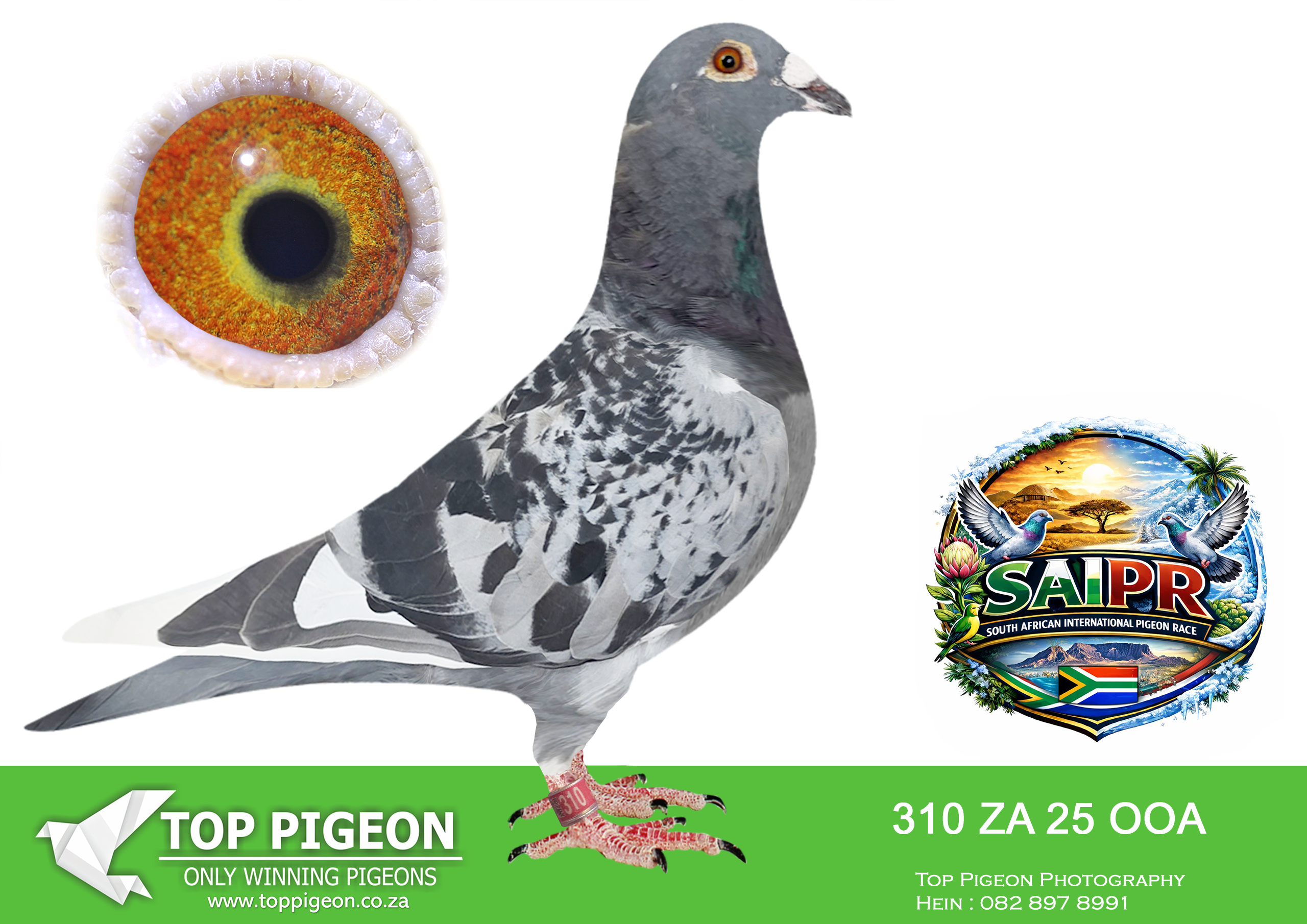 LOT 24 SAIPR SUMMER AUCTION 1 – Theuns Victor- VICTOR 107 2025 -9th Final Race WINNING R30 000.00——–SIRE:483 ZA 19 OOA .Alias “MR WOW” Strain: Tom Lock/Sablon Color: Blue Bar SUPER RACER 8 WEEKS IN A ROW FOR OOA LOFTS!! 7th Club, 18th VPU, Glen, Y/B, 286km, 1369mpm – 1993 pigeons 11th Club, 47th VPU, Tom’s Place, Y/B, 323km, 1416mpm – 2113 pigeons 49th Club, 152nd VPU, Springfontein, Y/B, 424km, 1014mpm————DAM:6493 ZA 21 KUR.Strain: Sablon/Tom Lock Color: Blue Bar.SEE PEDIGREE!!!!