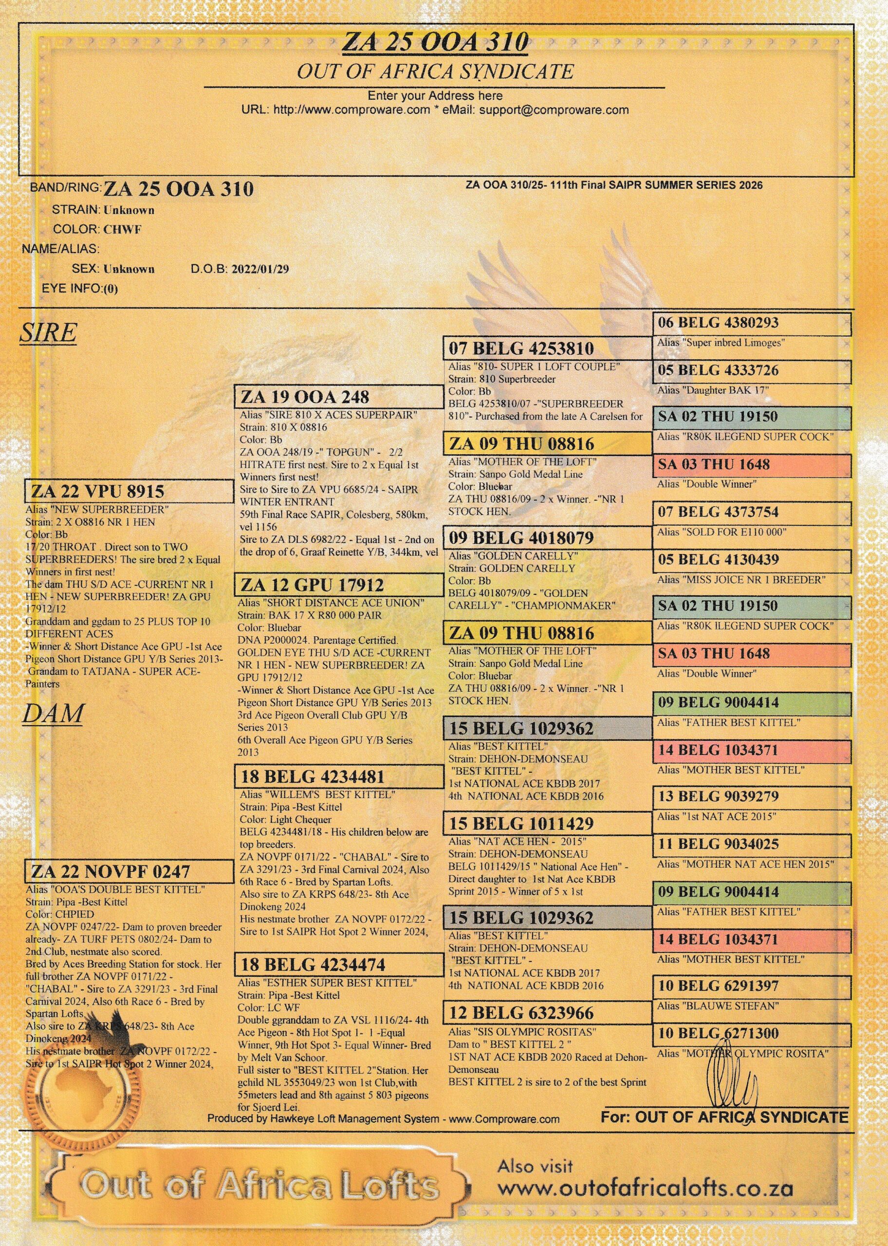 ZZ..LOT 141 SAIPR SUMMER AUCTION 1 –Cannistaro 1- OOA 310 2025 -SIRE:ZA 22 VPU 8915 Alas “NEW SUPERBREEDER Stain: 2 X 08816 NRI HEN Color:SUPERBREEDERS! The sire bred 2 x Equal Winners in first nest.————–DAM:ZA 22 NOVPF 0247 Alas OOA’S DOUBLE BEST KITTEL Strain Pipa-Best Kitel Color CHPIED.ZA NOVPF 0247/22- Dam to proven breeder already-ZA TURF PETS 0802/24-Dam to 2nd Club, nestmate also scored Beed by Aces Breeding Station for stock. Her full brother ZA NOVPF 0171/22- “CHABAL”- Sire to ZA 3291/23-3rd Final Carnival 2024, Also 6th Race 6-Beed by Spartan Lofts,.SEE PEDIGREE!!!!