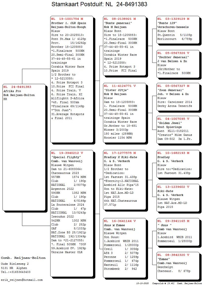 LOT 31 AFRIKAPRO AUCTION 4 – Tom van Gaver – Alberto Abajo ES-BE-25-4056614 -SIRE:BE 19-4216712 C.Perfect Finn Tom Van Gaver Geschelpt (G-) Father to: 2. Ace PIPR 2025 7. Prov 5.327 birds Toury 2024.115. Final OLR Sofia 480 km – 2022 111. H.S 6 VFWCPR 23. 262. Final VFWCPR 23 55. Ace AS Gold 2022 46. Fin AS Gold 2022 69.-82.-87.-69.-100. In hotspot race. 44. Prov 1.488 birds Ecouen I 2024 21. Comb 1.458 birds Montoire 2023 111. N.Z. 2.986 bird Bourges II 2023 121. N.Z. 1.937 bird Bourges I 2023 103 Prov 1.715 birds. Full brother FINN: 1. Prov 1.591 birds 1. N.Z. 2.761 birds 9. Nat 7.322 birds 1. Fastest 652 birds.—————DAM:BE 22-4198272 H Blue Finn Tetske 72 Tom Van Gaver Blauw G-Mother to winners: 1. Reg 642Km 2.807 b 2. Com 354Km 1.130 b 13.Com 354Km 668 b 29.Com 642Km 1.032 b 30.Reg 404Km 3.727 b 52.Com 298Km 1.198 b 8. Hotspot I 118 km 34. Final Race 501km 38.Ace bird. OLR..SEE PEDIGREE!!!