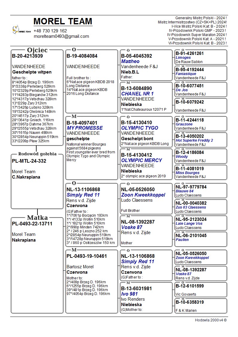 LOT 22 AFRIKAPRO AUCTION 5 – ZG Helios-DV-24-01777-626 -SIRE:01777-21-30 V.Father: 22. Pr. 480 km, 438 p. 1. Pr. 179 km, 652 p. AS Golden Pigeon Winter Race 2023 Half-siblings are parents of: – 1. Ace-Pigeon DapiRace 2018 – 1. Pr. Victoria Falls 2019, 450 km, 2.049 p. – 2. Pr Thailand Open 2010, 386 km, 512 p. – 8. Pr Upland-Derby 2016, 330 km, 617 p. – 9. Pr. Algarve Golden Race 2015, 505 km, 1.783 p. – 16. Pr.Victoria Falls 2019, 619 km, 1.482 p.————-DAM:02241-22-253 W.SIMON WOLF.Mother: 1. Ace-P. Long Distance 2. Ace P. Grand Average 5. Pr. 480 km, 505 p. 4. Pr. 325 km, 607 p. 26. Pr. 250 km, 668 p. As Golden Race GR Winter Father “Thomas 1” is brother “Thomas 6”; who won the Algarve Golden RACE 2018 by 24 minutes and was 8th ace pigeon. Mother comes from a brother-sister pairing. One million dollar race winner “Little Miss Nikki” mated to her nest brother “Dora”. “Little Miss Nikki” won 1st prize,SEE PEDIGREE!!!!